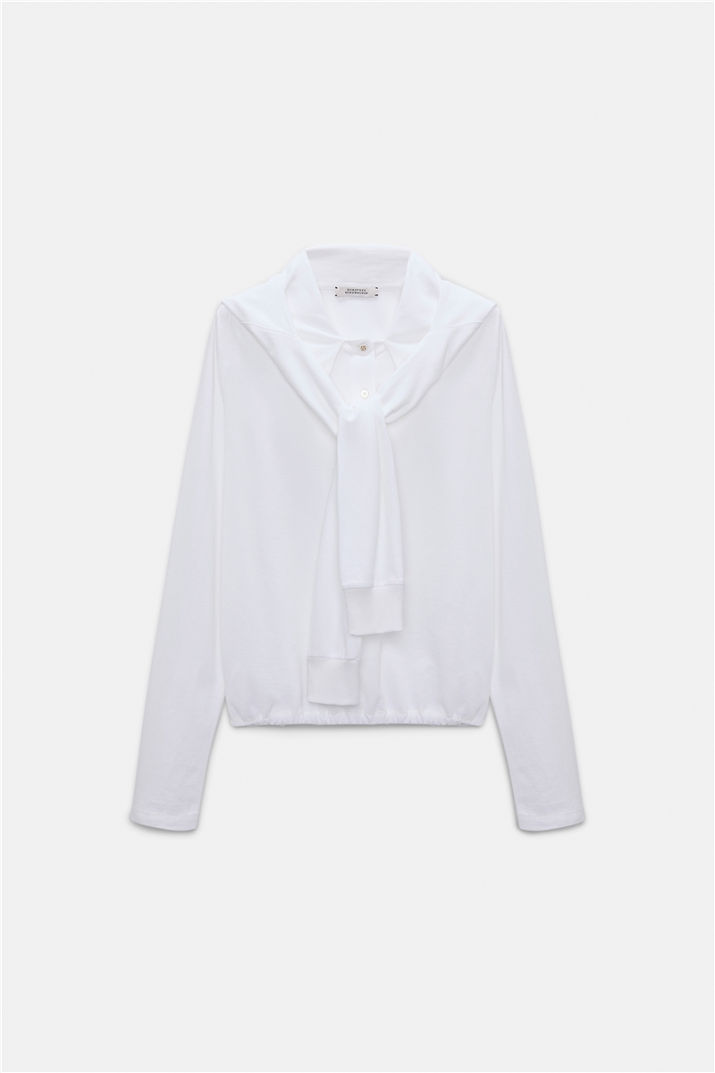 Ein sportiv-elegantes Longsleeve mit besonderem Layering-Effekt. Der feine Baumwollpiqué liegt weich auf der Haut und wirkt durch die drapierte Kapuze wie eine zweite, locker über die Schultern gelegte Schicht. Die langen Ärmel mit Bündchen lassen sich vorne binden und verleihen dem Design eine ruhige Dynamik. Eine reduzierte, moderne Silhouette von Dorothee Schumacher, die Komfort und stilvolle Lässigkeit selbstverständlich verbindet.