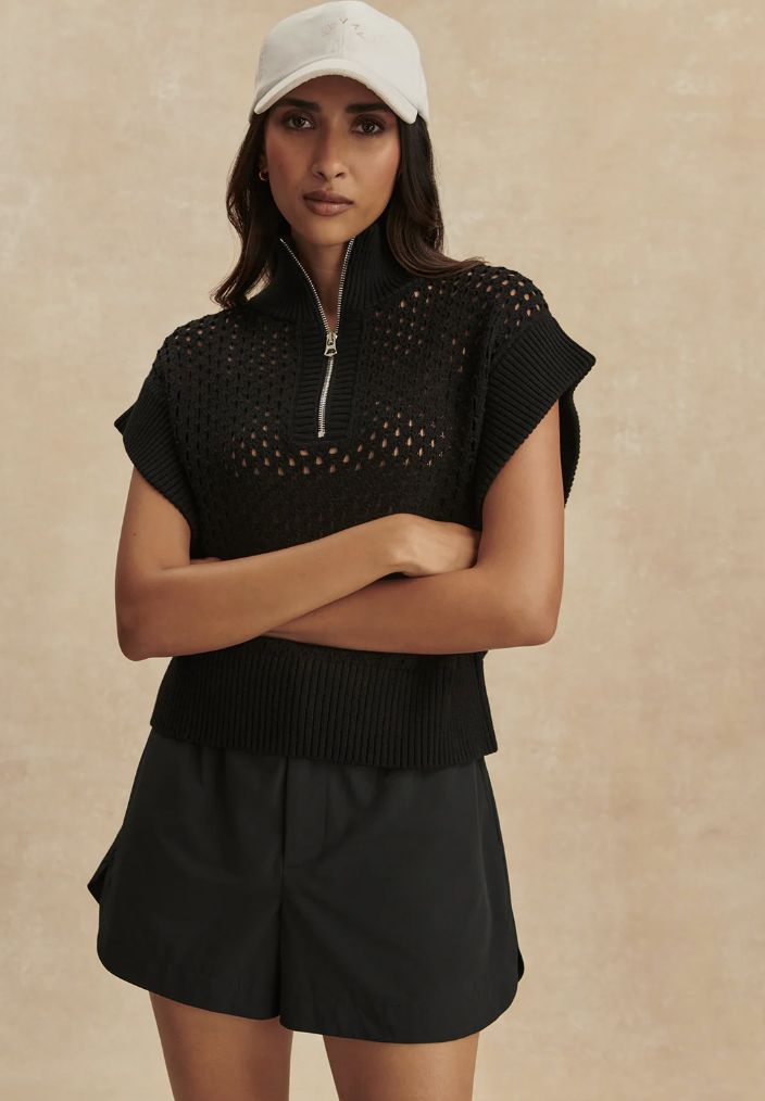 Das Gaines Knit von Varley lässt sich ideal mit schlichten Shorts oder einer cleanen Stoffhose kombinieren. Besonders stimmig wirkt der Look mit monochromen Styles in Schwarz oder Off-White. Ein dezentes Top oder Bralette darunter unterstreicht die luftige Struktur, während Sneaker oder leichte Slides den entspannten, modernen Charakter abrunden.