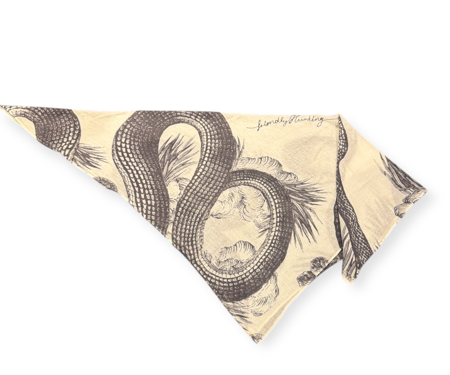 Zwischen floralen Elementen und organischen Formen windet sich die verführerische Schlange, nicht als Symbol der Versuchung, sondern als kraftvolles Tier voller Anmut und Weisheit – ein Sinnbild für die Philosophie von FRIENDLY HUNTING. Die harmonische Farbkomposition aus Beige, Rosé und Camel verleiht dem Tuch eine warme, luxuriöse Ausstrahlung.