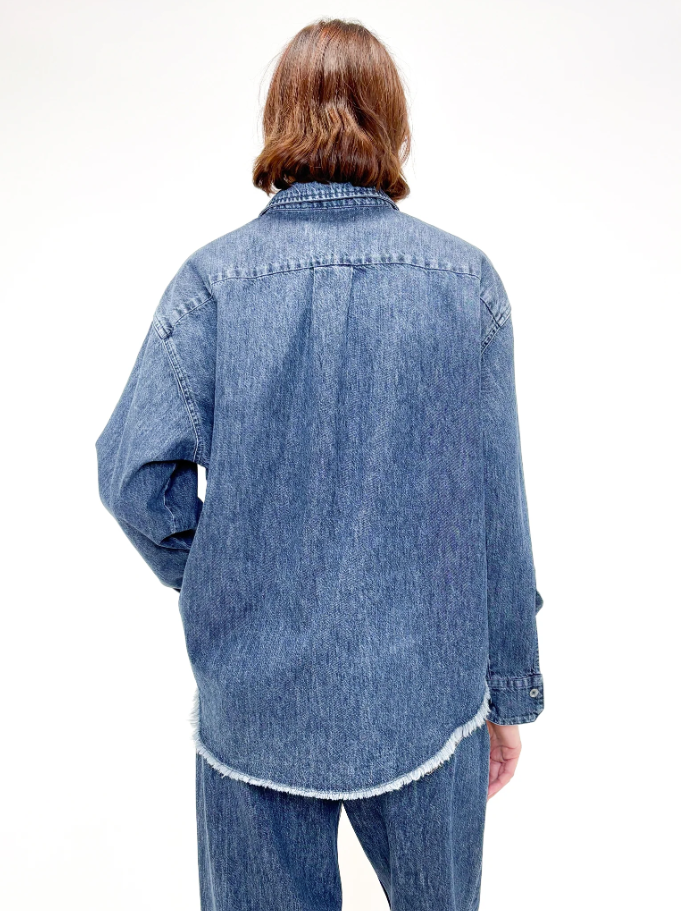 Diese Jeansbluse von ODEEH überzeugt mit einem authentischen, bewusst lässigen Look. Das ausgewaschene Jeansblau, die sichtbar dunkleren Partien ehemaliger Brusttaschen und das verlängerte, ausgefranste Rückenteil verleihen dem Modell einen markanten Used-Charakter mit modischem Anspruch.