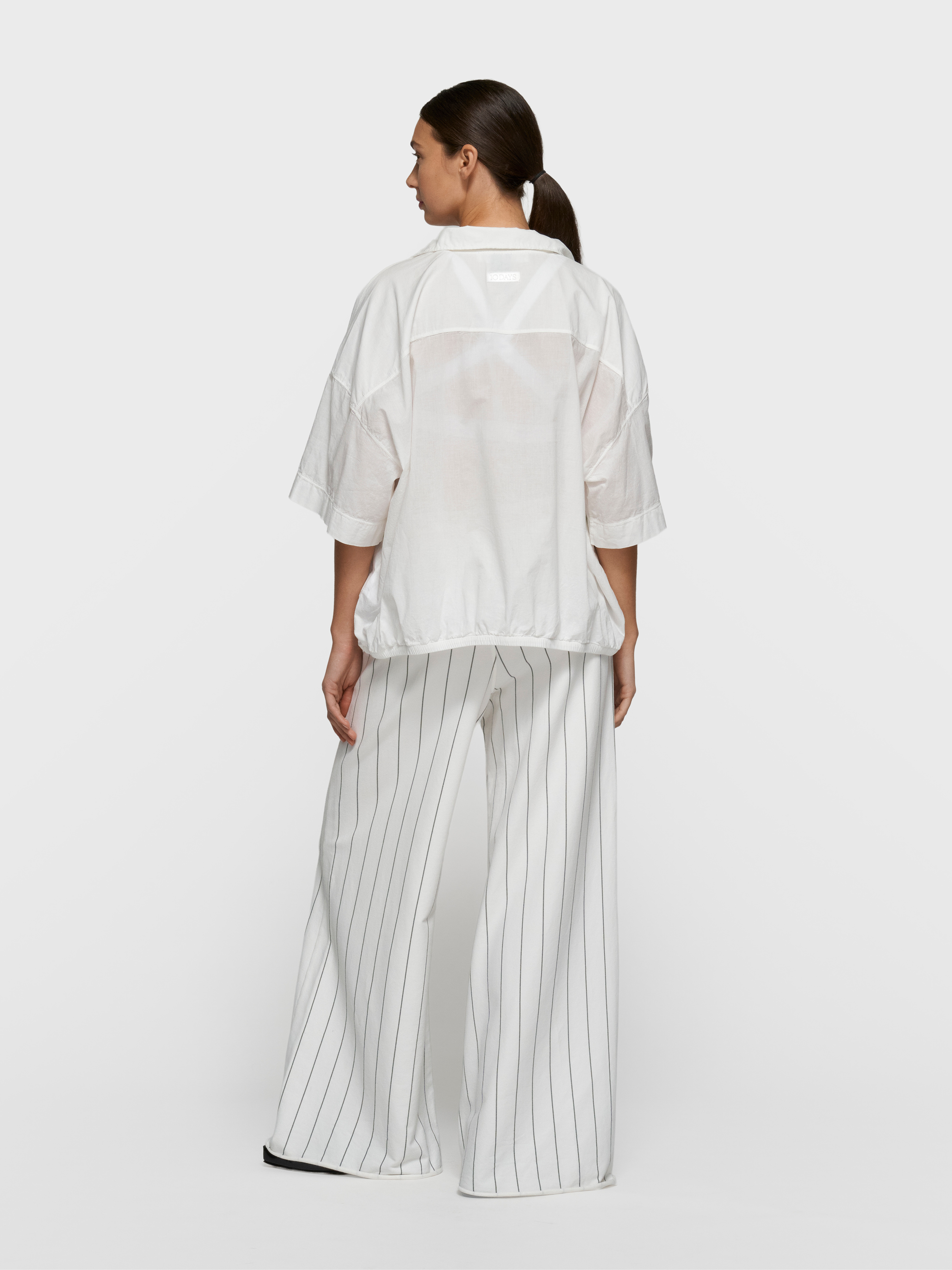 Leichte Popeline und eine großzügige Silhouette verleihen dieser Bluse von 10 Days eine moderne Selbstverständlichkeit. Die GOTS-zertifizierte Bio-Baumwolle fühlt sich angenehm weich an und sorgt für ein luftiges Tragegefühl. Kurze Ärmel und der elastische Saum unterstreichen den entspannten Charakter, während der klassische Knopfverschluss eine klare Linie setzt. Die aufgesetzte Tasche mit aufgesticktem „10“-Monogramm sowie das kleine transparente Label auf der Rückseite verweisen subtil auf die Handschrift von 10 Days und runden das Design mit feinen Details ab.