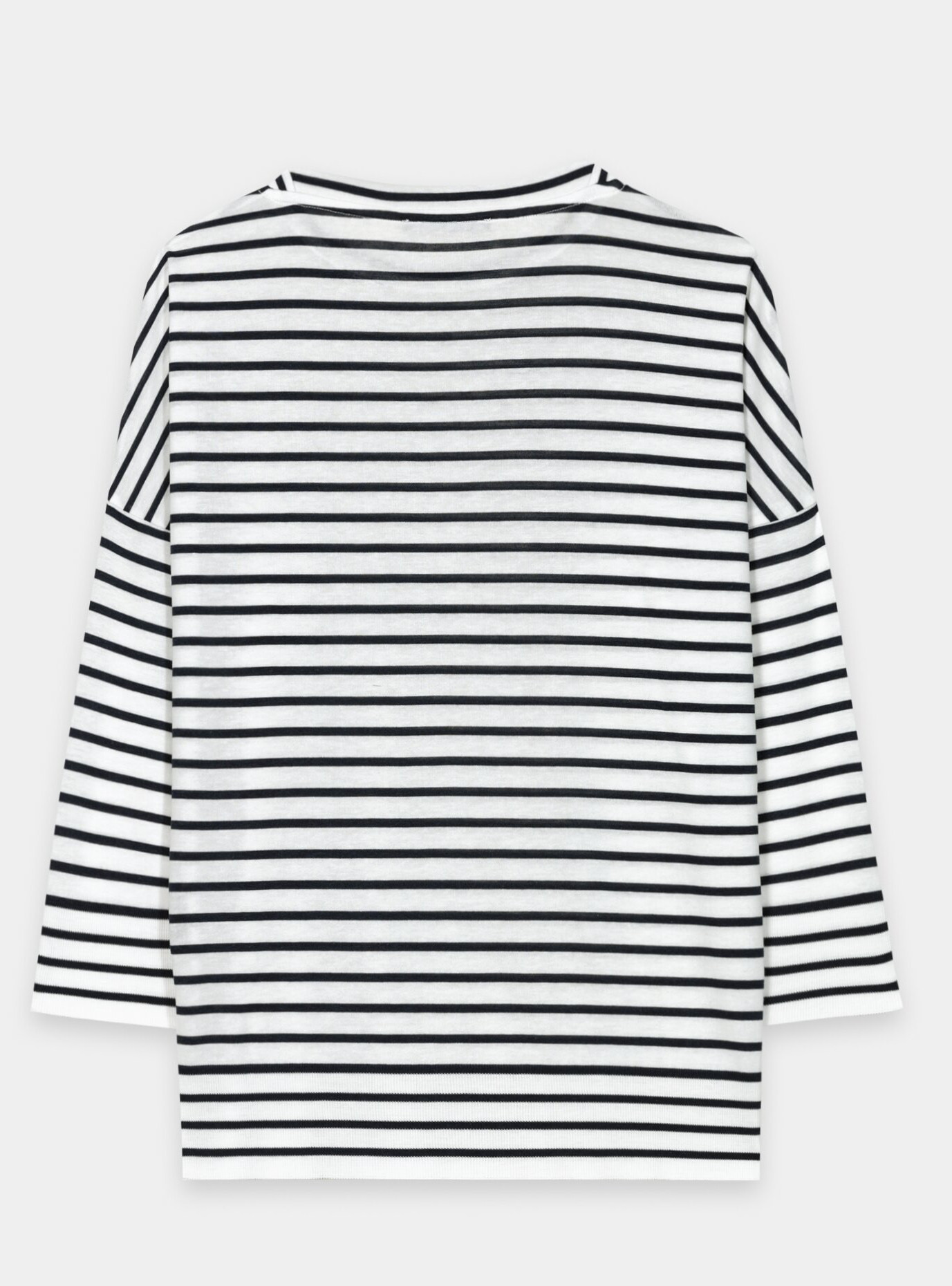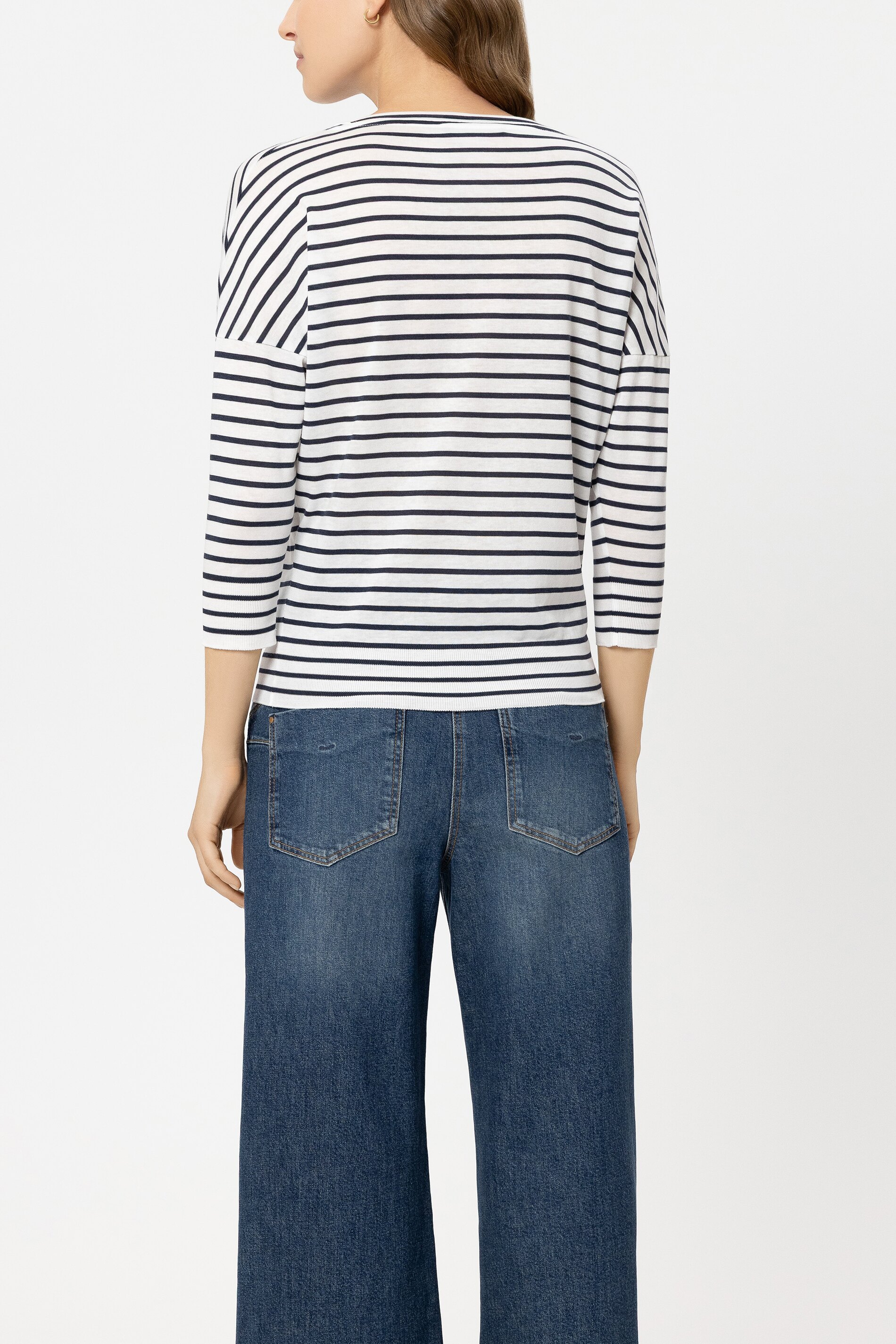 Dreiviertelärmel und Saum sind mit einem feinen Ribbund gearbeitet, was dem Shirt eine strukturierte und zugleich lässige Anmutung verleiht. Die Farbkombination Casual Blue–Cream sorgt für einen frischen, zeitlosen Look – perfekt für Alltag, Büro und entspannte City-Outfits.