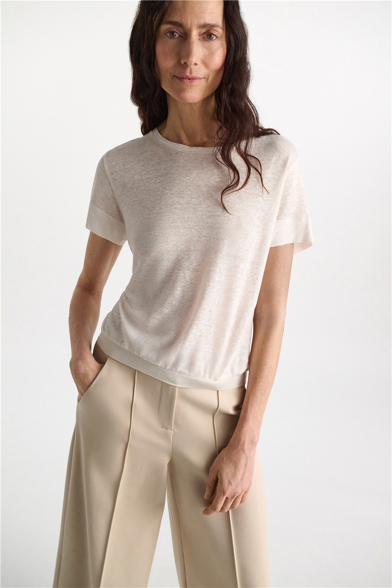 Das Shirt wird zu fließenden Stoffhosen oder soften Tailoring-Pieces getragen. Besonders harmonisch wirkt die Kombination mit Naturtönen oder monochromen Looks. Schlichte Sandalen oder leichte Sneaker unterstreichen die entspannte Eleganz des Materials.