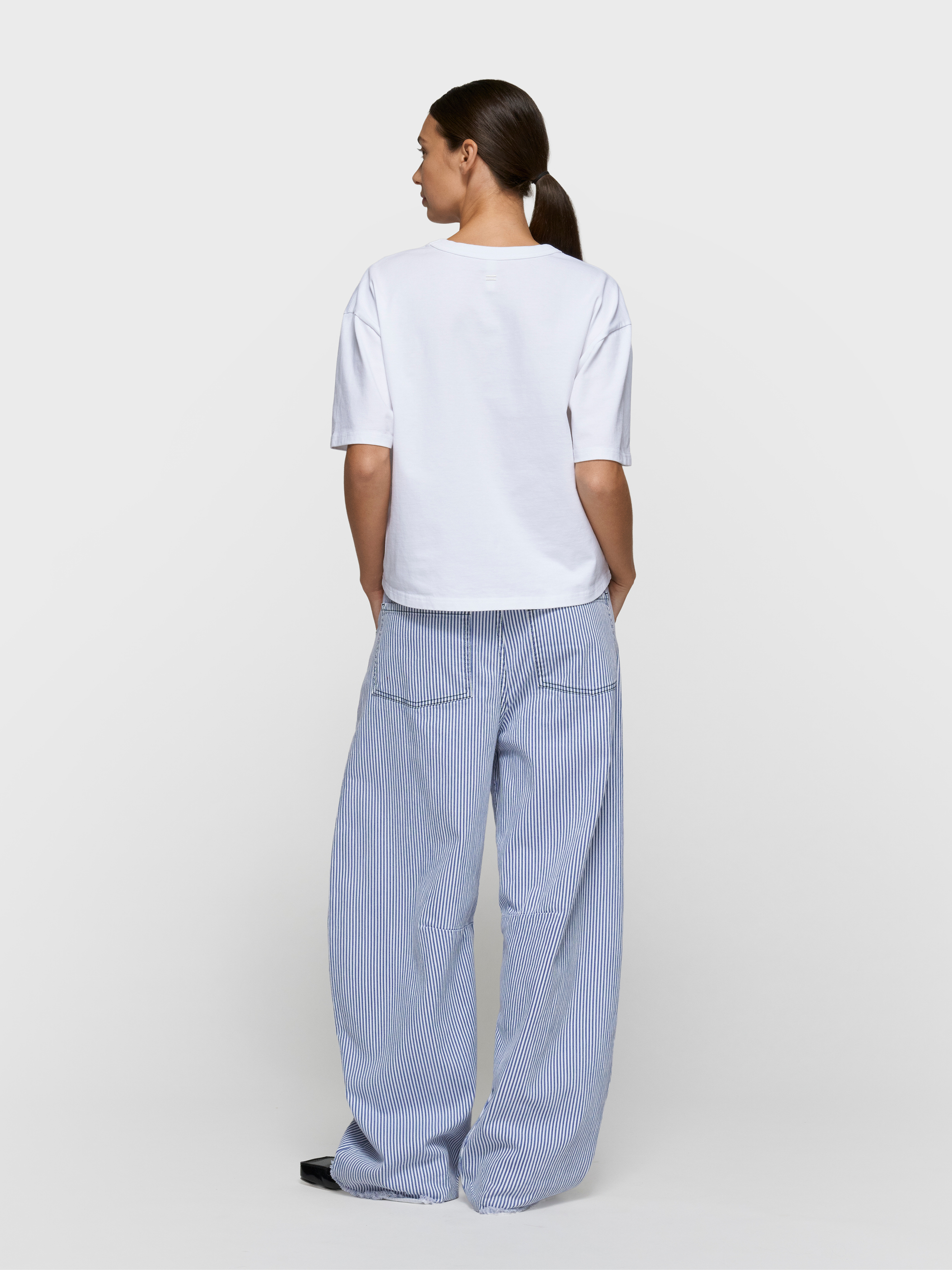 Klare Linien und ein sportiver Akzent prägen dieses V-Neck T-Shirt von 10 Days. Die weiche, GOTS-zertifizierte Bio-Baumwolle sorgt für ein angenehmes, natürliches Tragegefühl und eine ruhige, hochwertige Optik. Der feminine V-Ausschnitt verleiht der Silhouette Leichtigkeit, während der Frottee-Baseball-Aufnäher mit der Nummer 10 auf der Brust einen markanten, dennoch stilvollen Kontrast setzt. Die feine „Mini Stripes“-Stickerei auf dem Rücken rundet das Design mit einem dezenten Signature-Detail von 10 Days ab.