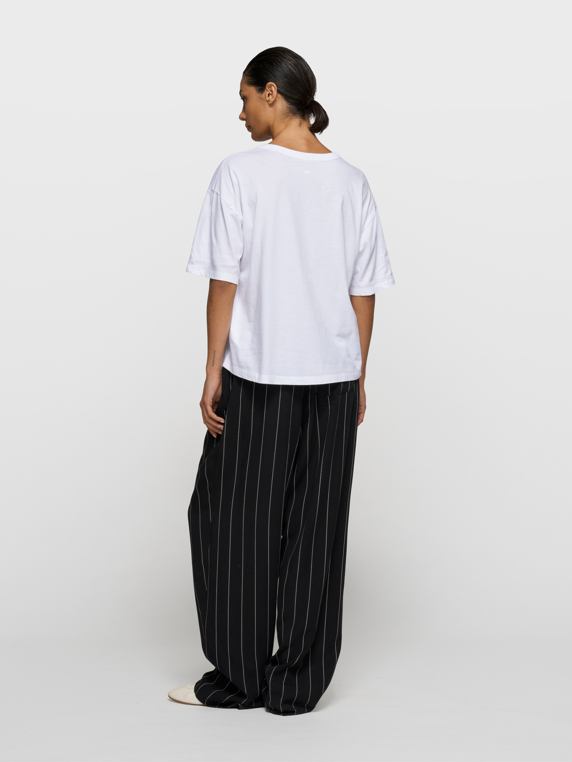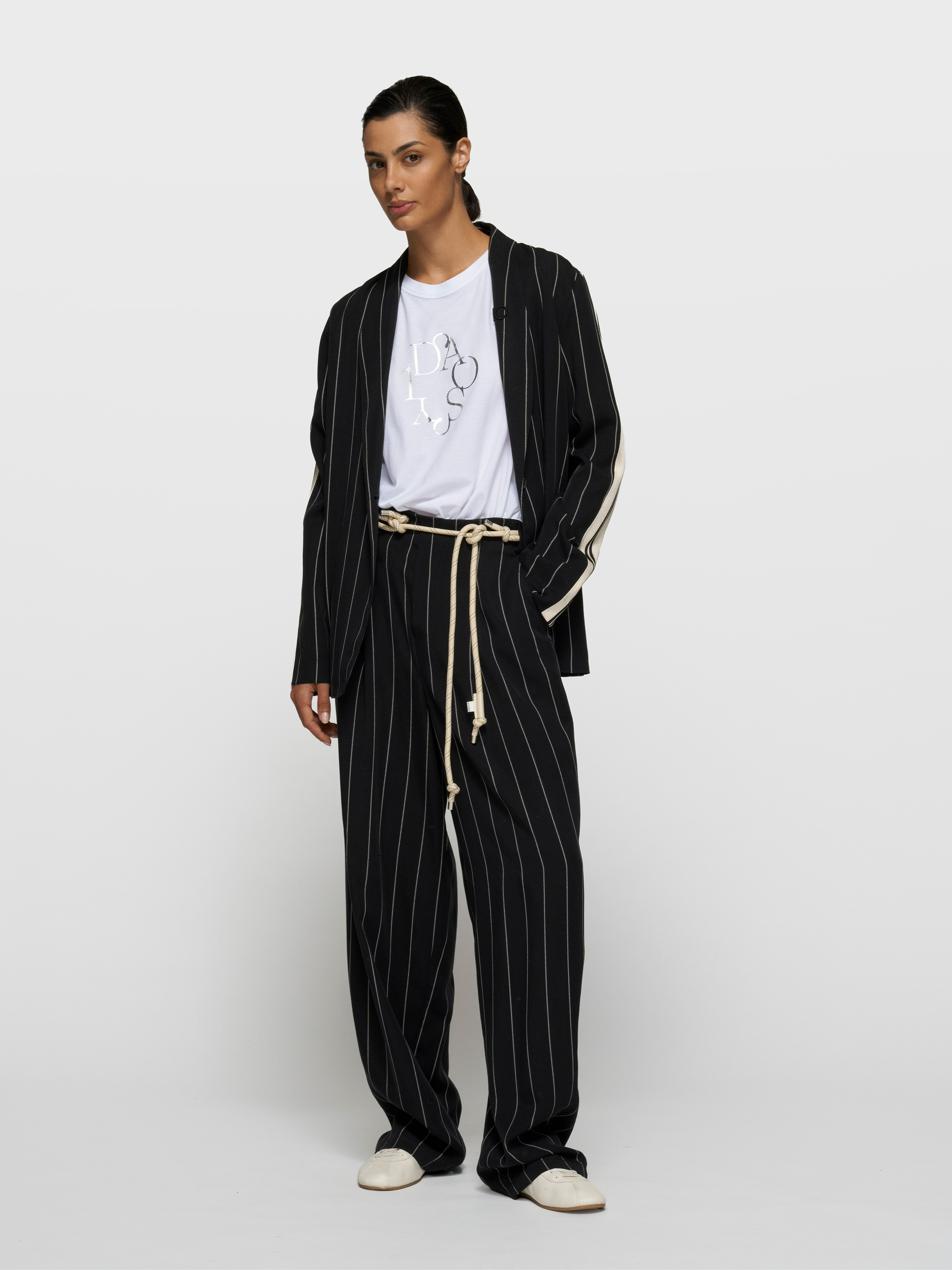 Mit einer weit geschnittenen Nadelstreifenhose oder einer soften Jogger entsteht ein moderner, entspannter Kontrast. Eine leichte Trainingsjacke oder ein Overshirt ergänzt das Outfit urban. Reduzierte Sneaker oder schlichte Loafer greifen die klare Formsprache auf.