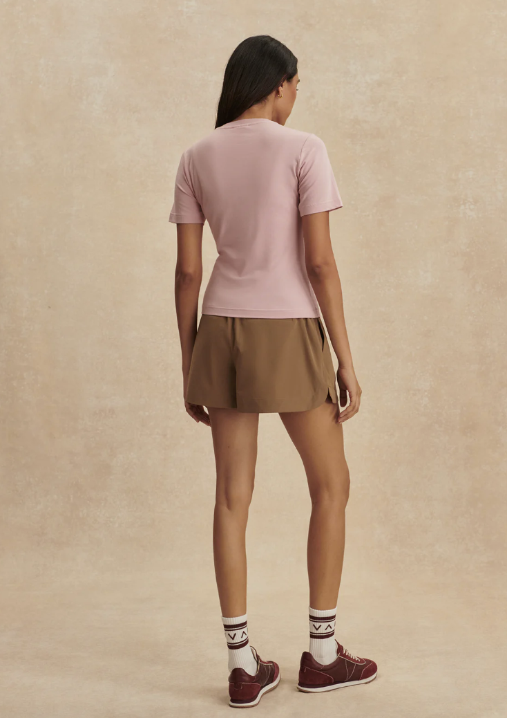 Das Regina Tee von Varley in Rose lässt sich ideal mit soften Naturtönen wie Sand, Creme oder Taupe kombinieren. Besonders stimmig wirkt es zu leichten Shorts oder fließenden Hosen. Ergänzt mit cleanen Sneakern oder minimalistischen Sandalen entsteht ein entspannter, moderner Alltagslook.