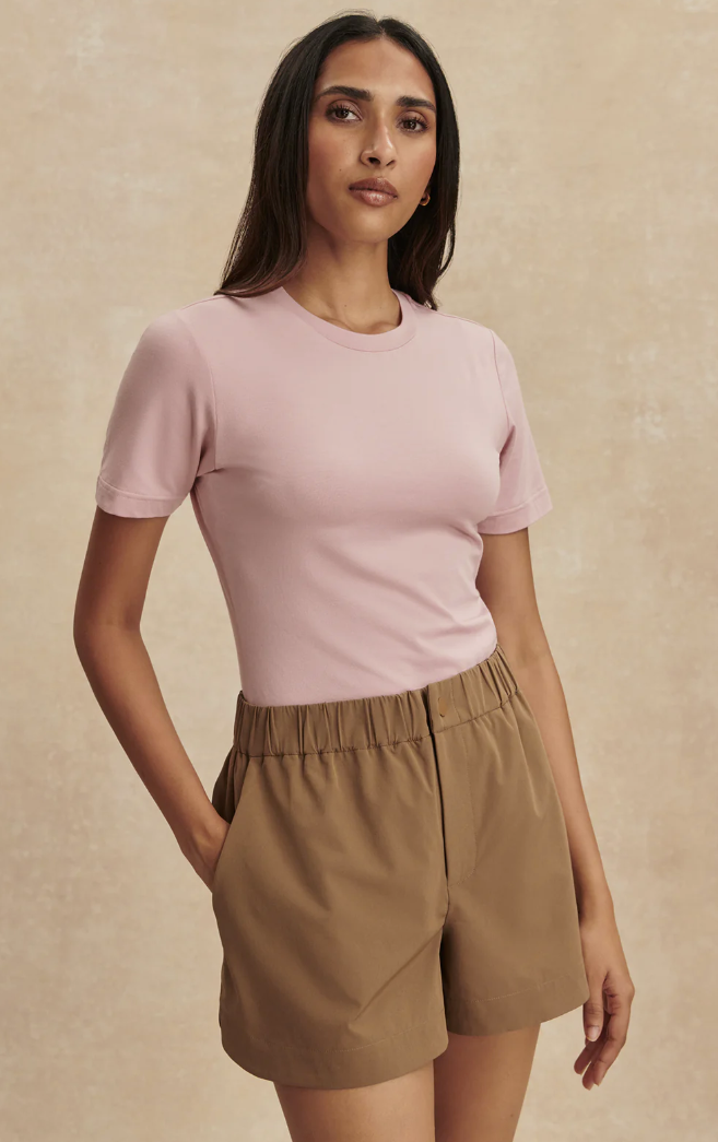 Das Regina Tee von Varley zeigt sich als klares Essential mit femininer Linienführung. Die weiche Modal-Jersey-Qualität schmiegt sich angenehm an den Körper, während die taillierte Silhouette und die präzise gesetzten Ärmel eine ruhige, gepflegte Ausstrahlung schaffen. In Rose wirkt das Modell weich und modern – ein vielseitiges Basic für jeden Tag.