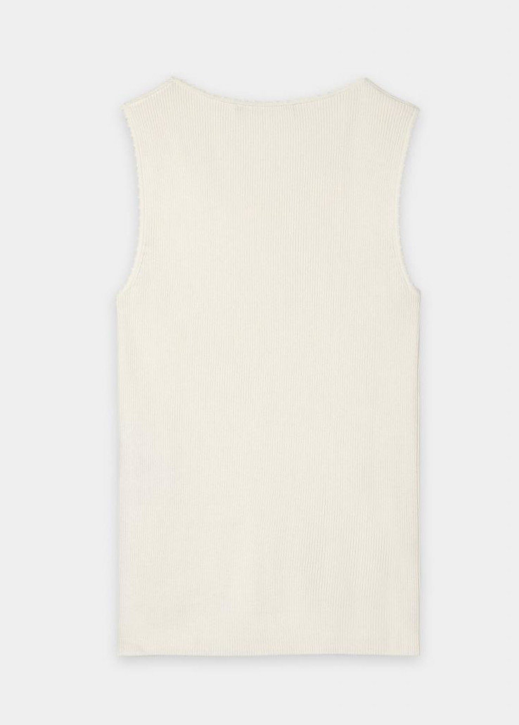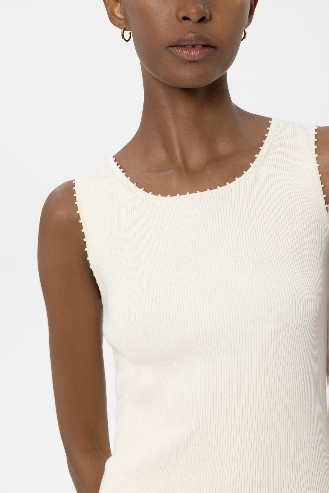 - Schnitt/Passform: Figurnah, ärmellos, Rundhalsausschnitt, feiner Rippstrick, Picot-Kante an Ausschnitt und Armausschnitt