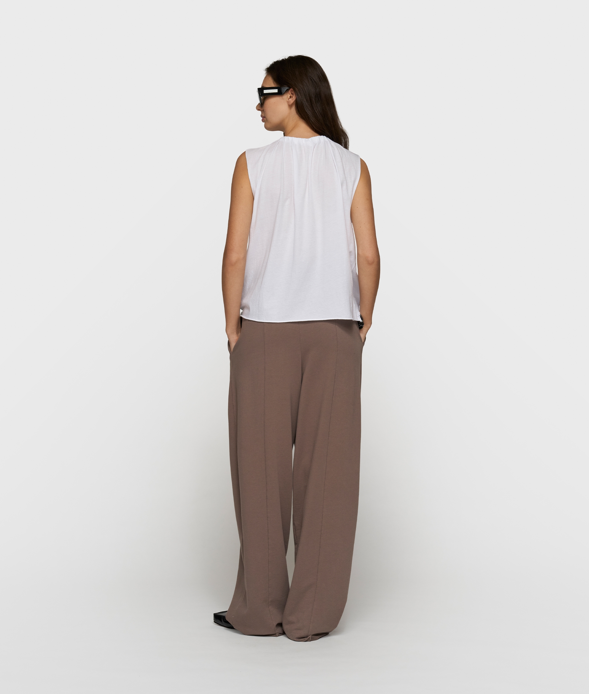 In Weiß wirkt das Top besonders frisch und reduziert. In Kombination mit weiten Hosen in Naturtönen oder soften Shorts entsteht ein ausgewogener Look. Dezente Accessoires und klare Schuhe greifen die ruhige Linie stimmig auf.