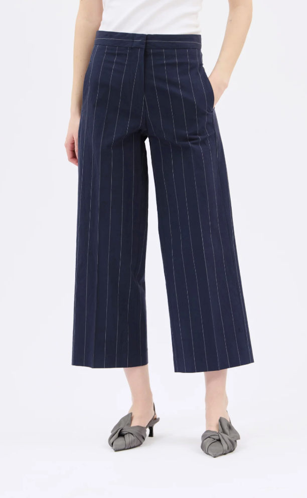 Maskuline Klarheit trifft auf moderne Leichtigkeit: Die „Papertouch Stripe“ Hose von ODEEH interpretiert klassische Anzugdetails neu. Der feine weiße Nadelstreifen auf tiefem Marine wirkt präzise und ruhig, während die leicht ausgestellte Silhouette eine subtile Dynamik in den Look bringt.