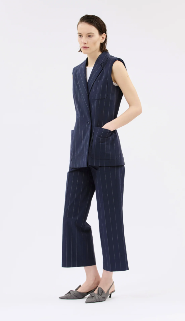 In Kombination mit der passenden Papertouch Stripe Weste entsteht ein souveränes Set mit klarer Aussage. Für einen reduzierten Sommerlook wirkt die Hose ebenso stimmig mit einem schlichten weißen T-Shirt und feinen Sandalen oder Loafern. Die leicht ausgestellte Form harmoniert besonders gut mit schlanken Schuhsilhouetten.