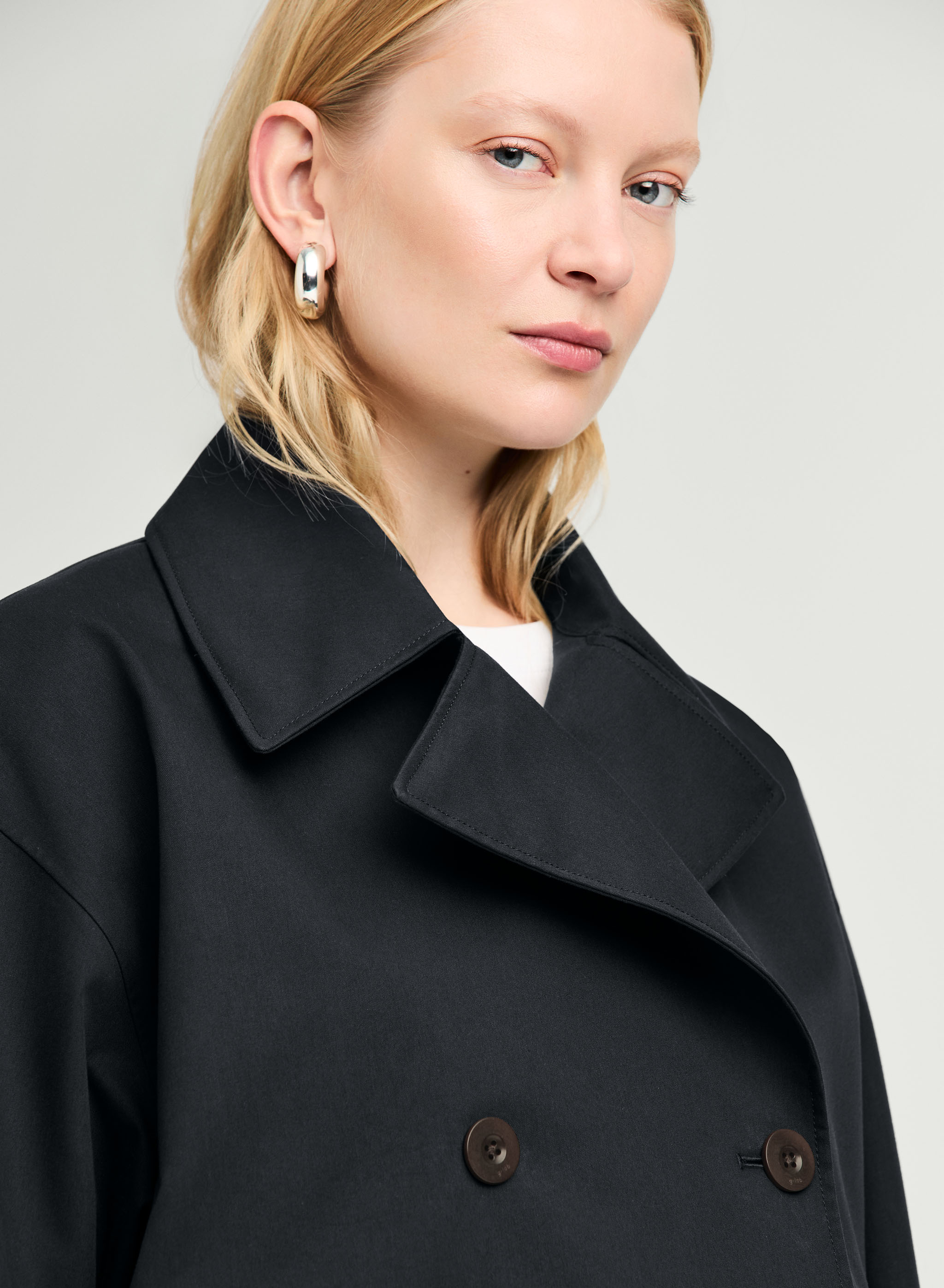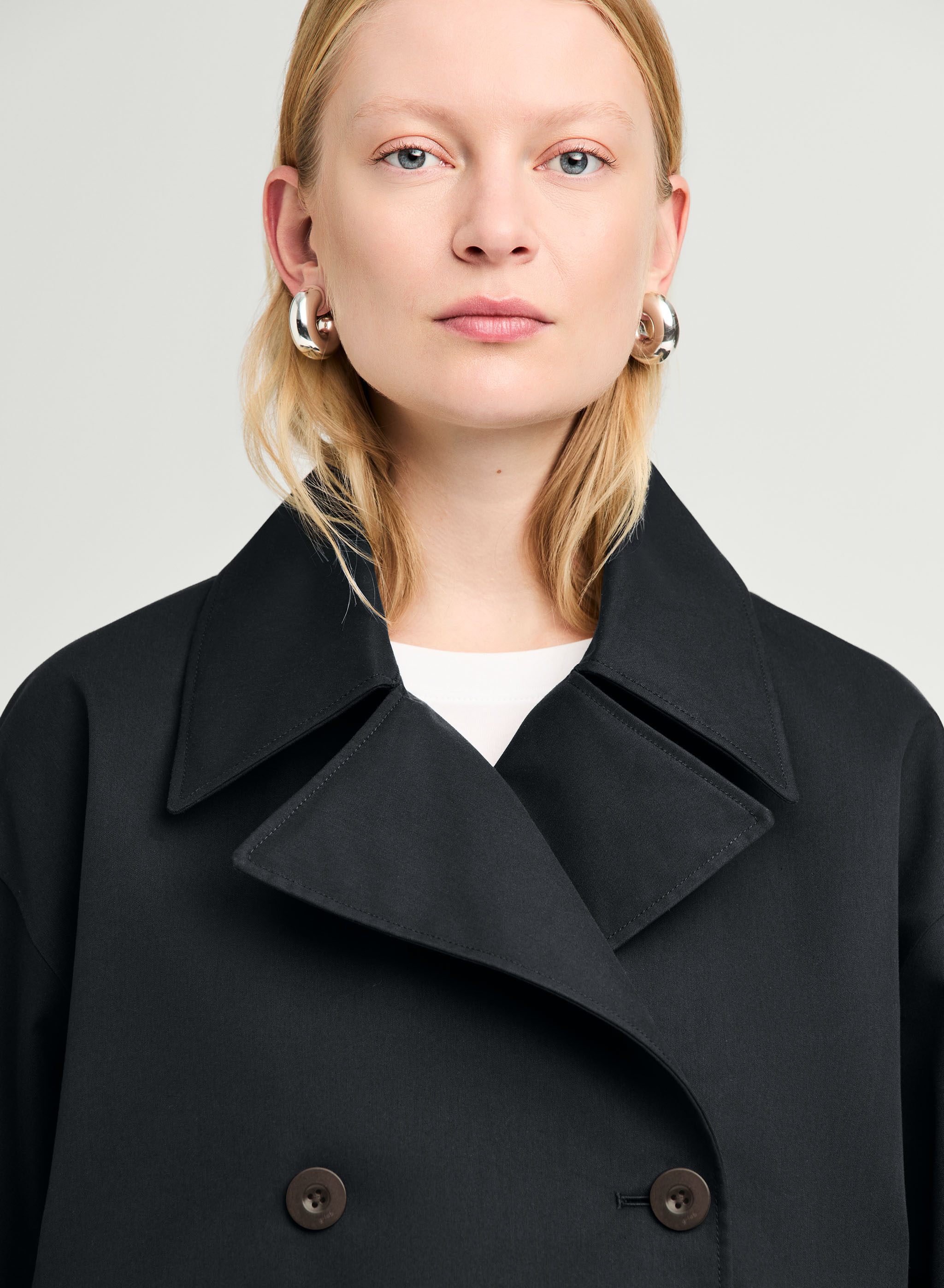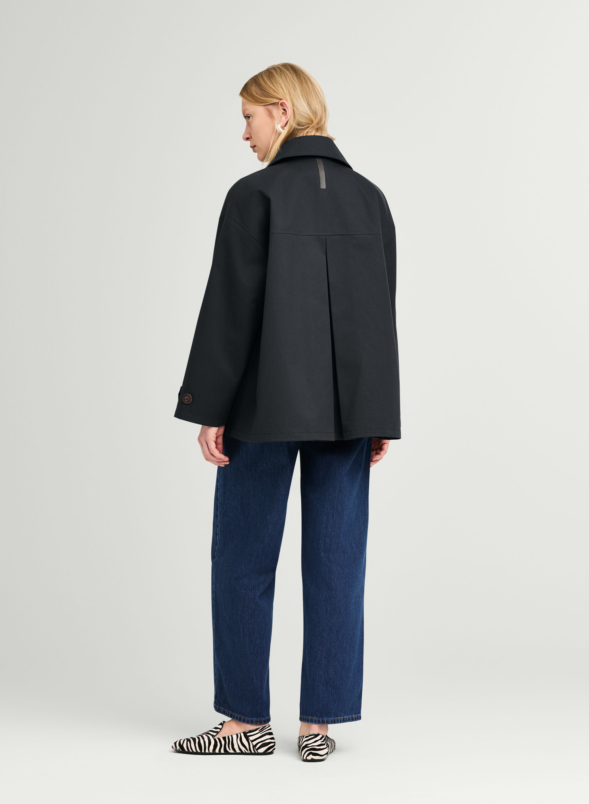 Der zweireihige Schnitt mit markanten Knöpfen und klar definiertem Kragen greift die ikonische Trench-Ästhetik auf und übersetzt sie in eine zeitgemäße, verkürzte Silhouette. Ärmelriegel mit Knopfdetail und dezente Magnettaschen fügen sich funktional in das reduzierte Design ein. Der orangefarbene Hangerloop setzt einen charakteristischen Akzent im Inneren.