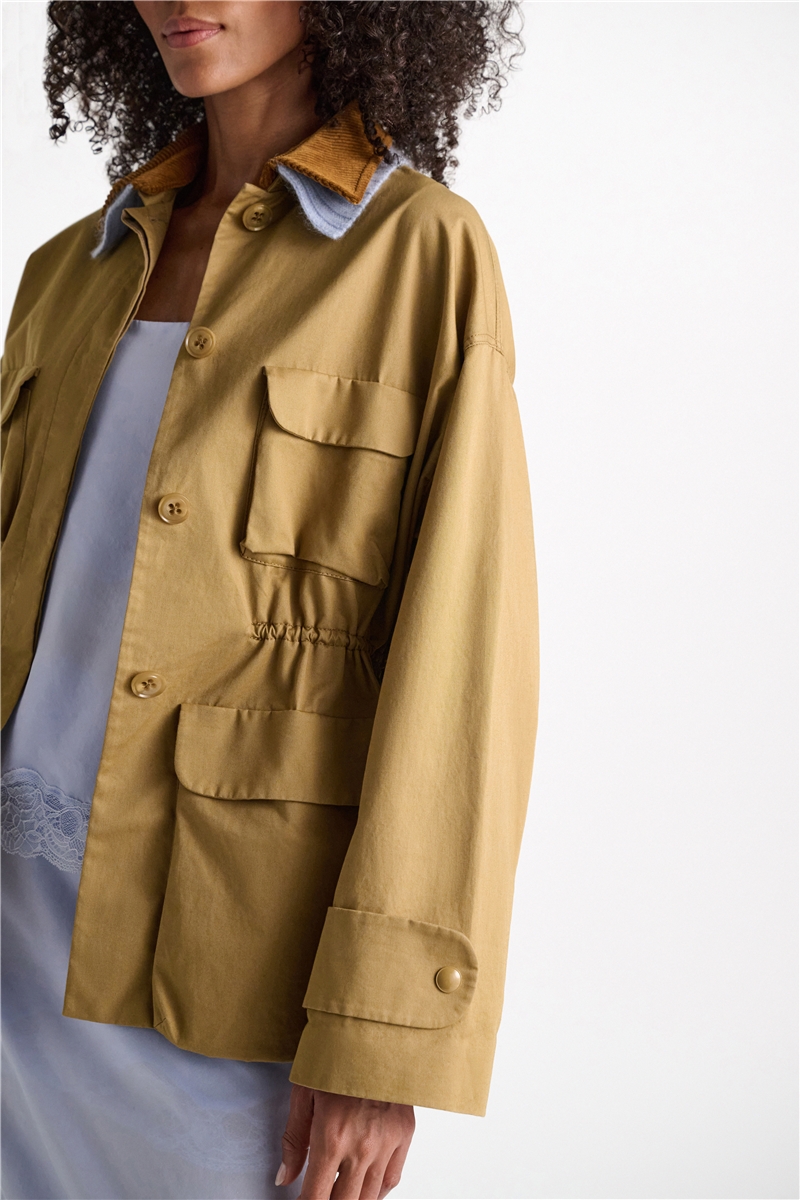 Die Jacke ADVENTUROUS MOVEMENT von Dorothee Schumacher verbindet funktionale Klarheit mit einer modernen, entspannten Silhouette. Als Neuinterpretation des klassischen Field Coats wirkt sie zugleich lässig und durchdacht. Die ungefütterte Baumwolle trägt sich leicht auf der Haut, während der abnehmbare, mehrlagige Kragen und der Tunnelzug in der Taille subtile Akzente setzen. Aufgesetzte Taschen und feine Ventilationsöffnungen unterstreichen den utilitären Charakter. In der Nuance Desert entsteht ein ruhiger, natürlicher Look mit urbaner Selbstverständlichkeit.