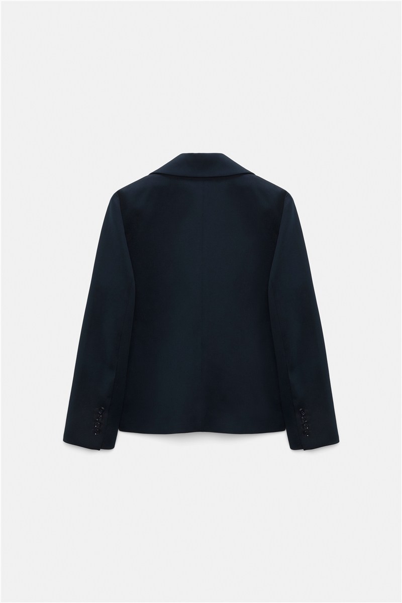 - Schnitt/Passform: Verkürzte Länge, leicht A-förmig geschnitten, 3/4-Ärmel, Reverskragen, Einreiher mit aufgesetzten Taschen und Ärmelschlitz, ungefüttert