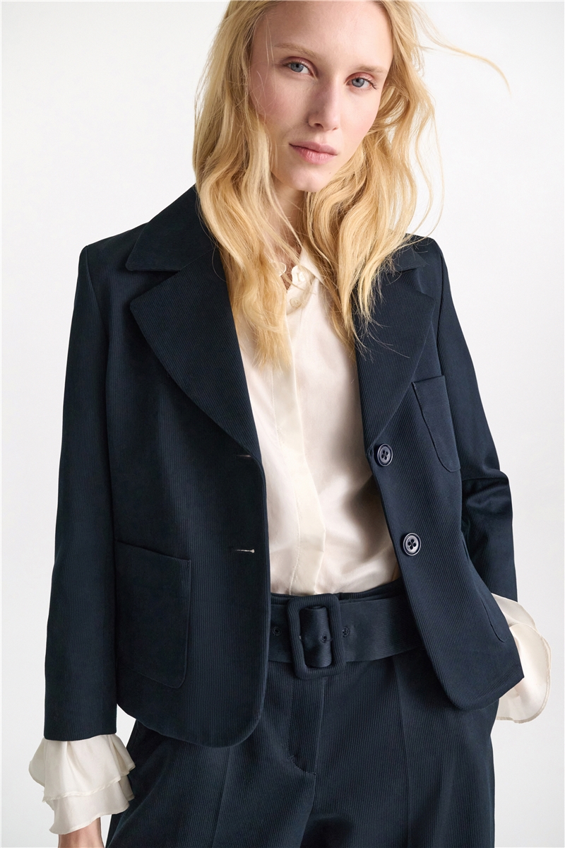 Der Blazer MODERN STRUCTURE von Dorothee Schumacher interpretiert klassische Tailoring-Elemente in moderner, verkürzter Form. Die klare Linie des Reverskragens trifft auf eine leicht A-förmig verlaufende Silhouette, die dem Modell eine subtile Dynamik verleiht. Die 3/4-Ärmel und die ungefütterte Verarbeitung aus reiner Baumwolle sorgen für Leichtigkeit und eine selbstverständliche Eleganz. In Dark Navy wirkt der Petit Blazer ruhig, präzise und vielseitig – ein reduziertes Statement für strukturierte Looks.