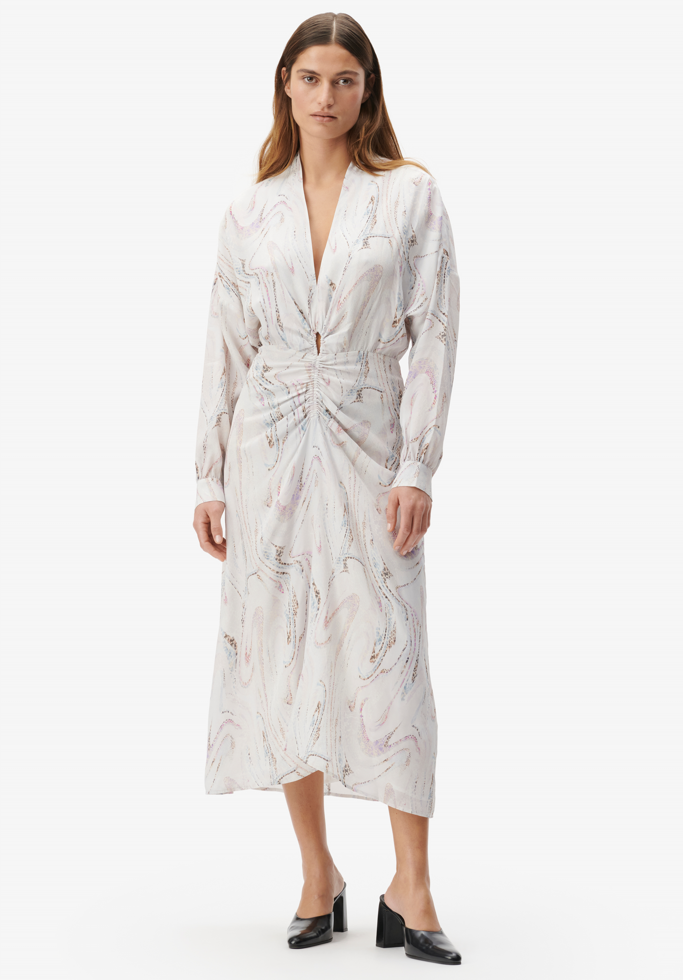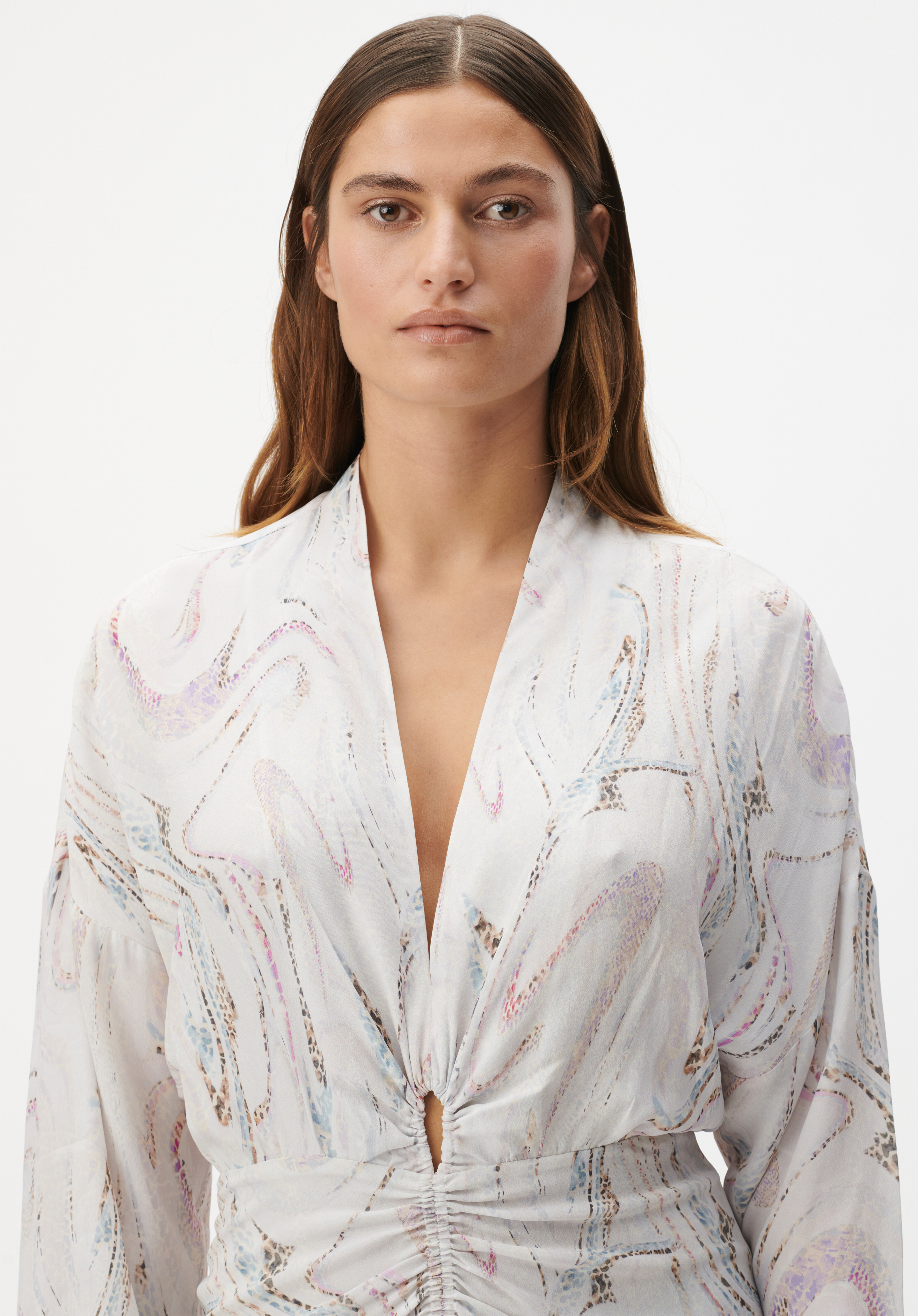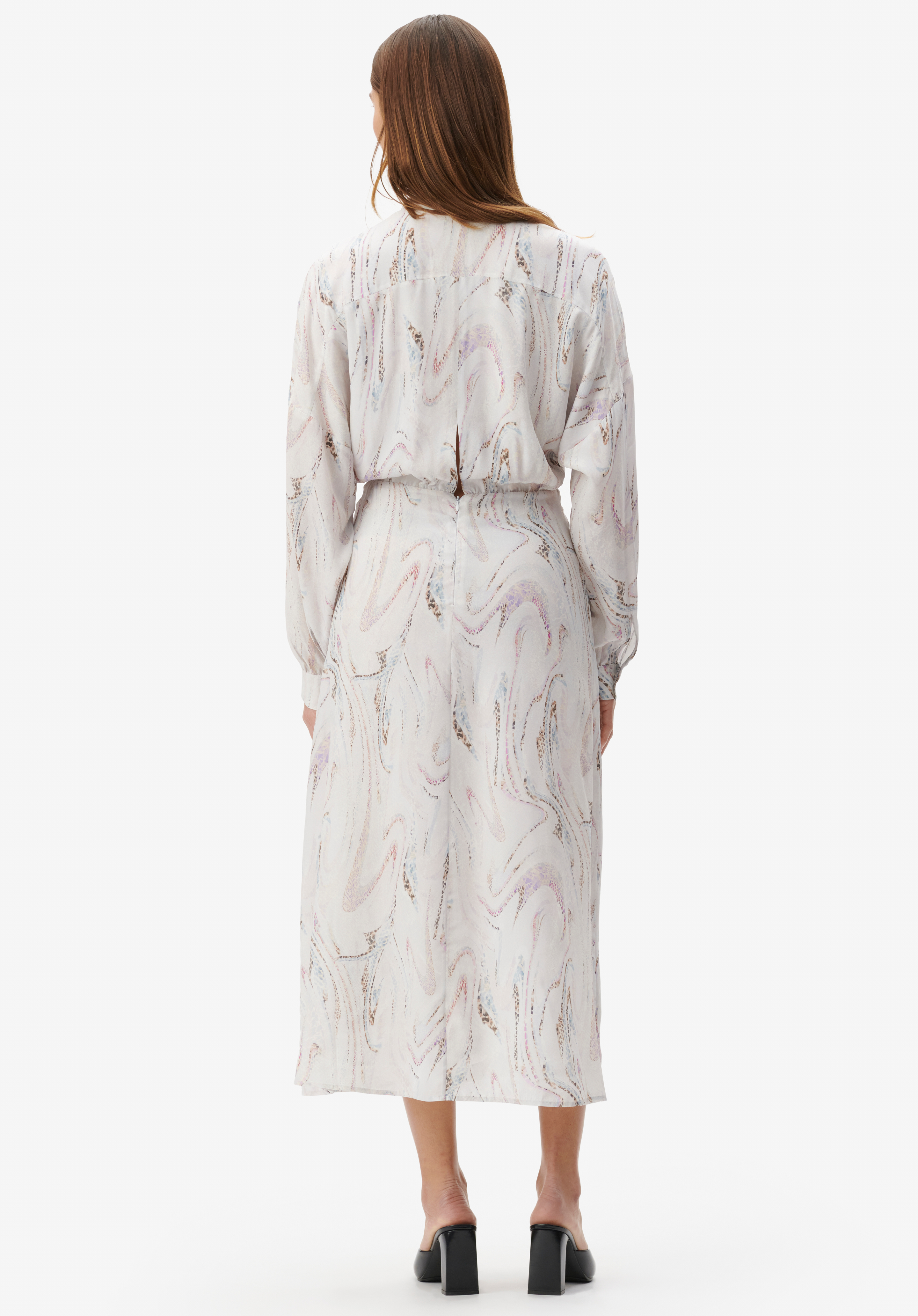 Die moderne Version des Hemdkleides von LALA BERLIN aus einem fließendem Crépe de Chine Stoff mit achatblauem Druck.