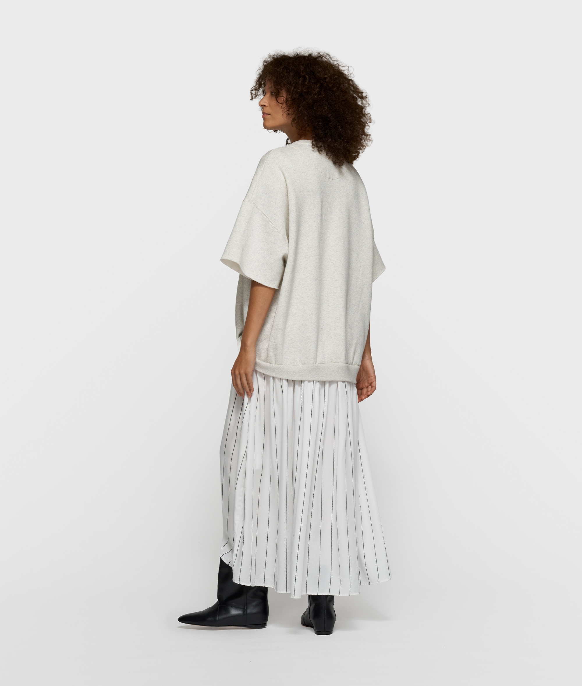 Ein spannender Materialmix und eine bewusst großzügige Silhouette verleihen diesem Kleid von 10 Days seine moderne Präsenz. Der obere Teil aus weichem Babyfleece umhüllt sanft und sorgt für ein angenehmes Tragegefühl, während der untere Part aus dezent gestreiftem Twill fließend fällt und dem Design Leichtigkeit verleiht. Der Rundhalsausschnitt mit Rippenstrickdetails und das Raw-Edge-Finish an den Ärmeln setzen entspannte Akzente. Faltendetails auf der Vorderseite sowie die Knopfleiste im Rockteil unterstreichen die durchdachte Konstruktion. Die feine „Curly 10“-Stickerei auf der Brust verweist subtil auf die Handschrift von 10 Days und rundet den Look stimmig ab.