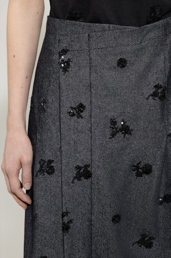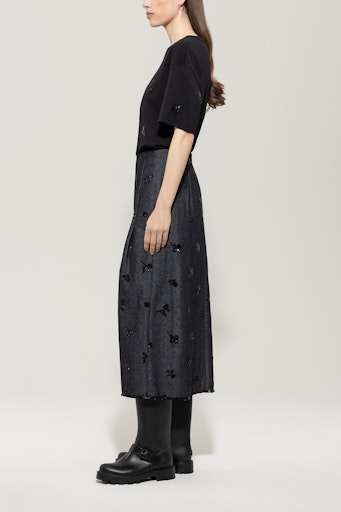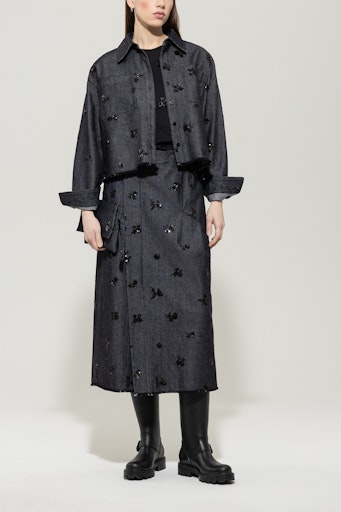 Ein Rock von LUISA CERANO mit Wow-Faktor: Der Look vereint strukturierte Denim-Optik mit eleganter Blumenstickerei aus schwarzen Pailletten. Die dezente Wickeloptik mit Faltendetails bringt Bewegung ins Design, während der offene Saum und der Gehschlitz einen modernen, lässigen Akzent setzen. Die Kombination aus Funktionalität und femininer Raffinesse macht diesen Rock zum idealen Begleiter – ob zum passenden Hemd oder ganz casual.