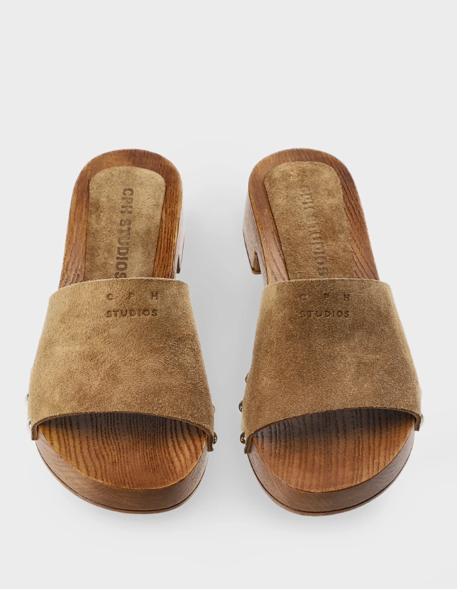 Die Clog-Sandale CPH798 von Copenhagen Studios verbindet skandinavische Klarheit mit einer markanten Silhouette. Weiches Veloursleder in warmem Braun formt den breiten Riemen und sorgt für eine ruhige, natürliche Oberfläche. Die charakteristische Holzsohle mit leichtem Absatz verleiht dem Modell Struktur und unterstreicht den modernen Clog-Charakter. Silberfarbene Nieten setzen dezente Akzente an der Seite und greifen den handwerklichen Look auf. Das offene Design wirkt unkompliziert und zugleich ausdrucksstark – ein lässiger Begleiter für sommerliche Tage.
