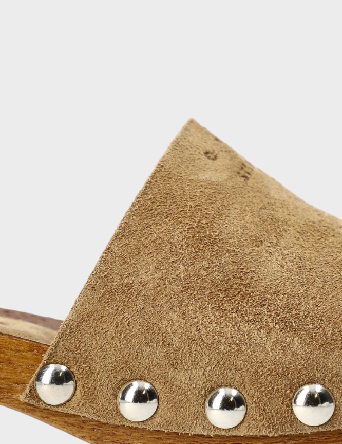 - Clog-Sandale mit breitem Veloursleder-Riemen, markante Holzsohle mit Absatz, seitliche silberfarbene Nieten, offene Zehenpartie