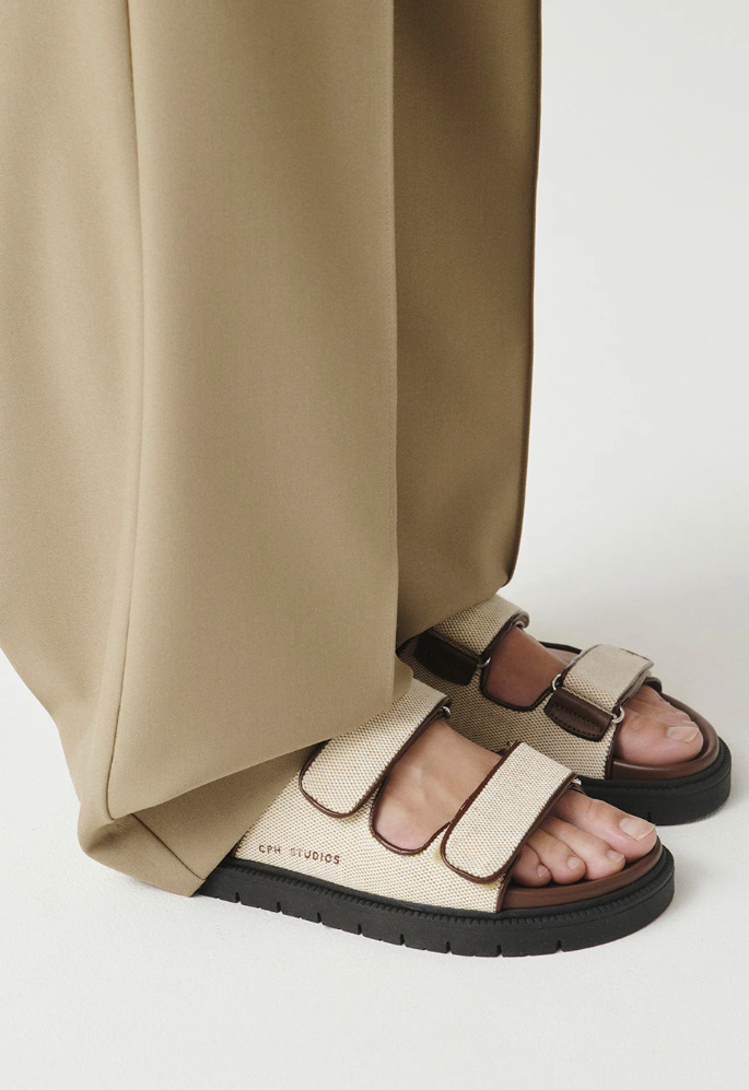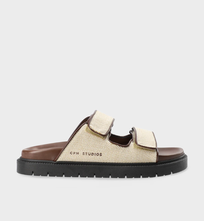 Klare Linien und ein reduzierter Materialmix prägen diese Sandalen von Copenhagen Studios. Weiches braunes Glattleder trifft auf cremefarbenes Textil und schafft einen ruhigen, modernen Kontrast. Die breiten Riemen mit Klettverschluss geben dem Design Struktur und sorgen zugleich für ein unkompliziertes Tragegefühl. Eine gepolsterte Lederinnensohle und die flexible, rutschfeste Sohle unterstreichen den komfortablen Charakter, während das dezente Logo an der Außenseite den minimalistischen Look abrundet. In Kopenhagen entworfen und in Europa gefertigt, verbinden diese Sandalen skandinavische Klarheit mit hochwertiger Handwerkskunst.