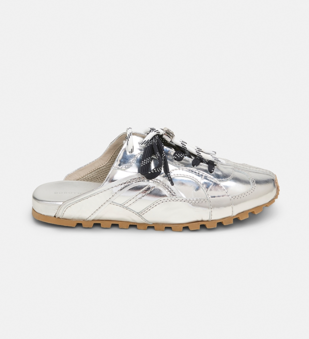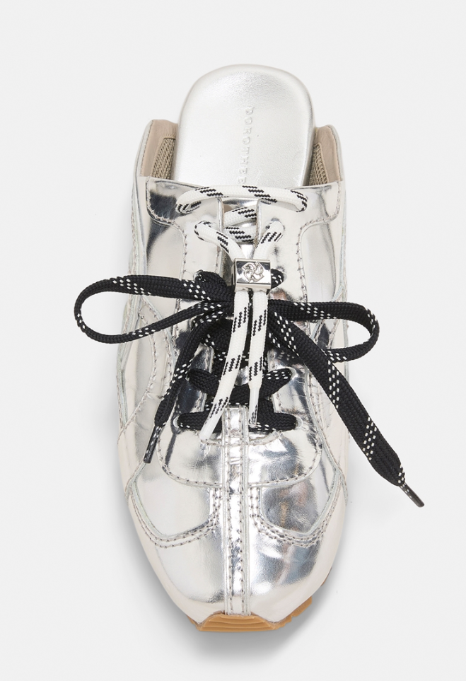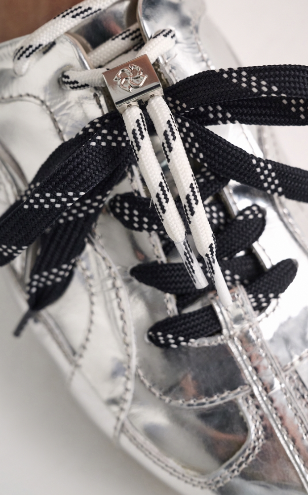 Ein hybrider Entwurf zwischen Sneaker und Pantolette, der mit reflektierendem Metallic-Leder und sportiven Details spielt. Das verspiegelte Finish verleiht dem Modell von Dorothee Schumacher eine moderne Strahlkraft, während die kontrastierenden Nylonschnürsenkel und der charakteristische D-Rose-Stopper funktionale Akzente setzen. Die offene Fersenpartie sorgt für Leichtigkeit im Alltag, das gepolsterte Fußbett für angenehmen Tragekomfort.