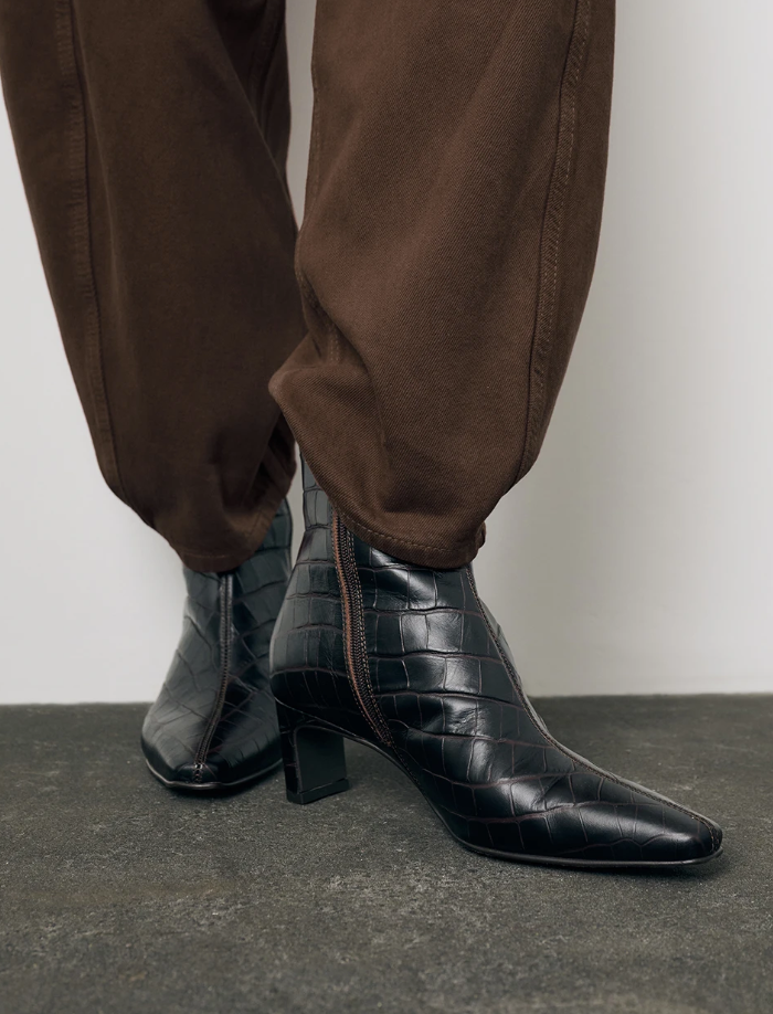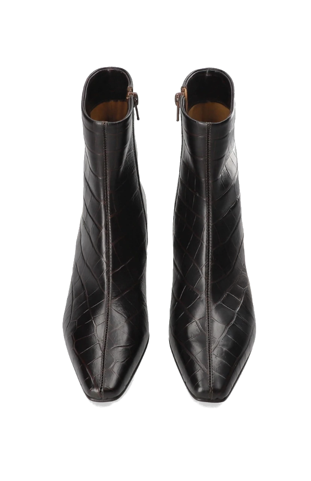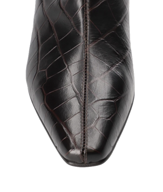 Die spitz zulaufende Silhouette trifft auf strukturierte Eleganz und ein ausdrucksstarkes Finish: Diese Ankle Boots von COPENHAGEN aus geprägtem Croco-Leder in sattem Braun verbinden minimalistisches Design mit einem markanten, architektonischen Absatz. Die charaktervolle Oberfläche verleiht dem Modell subtile Extravaganz – ein Statement für alle, die Understatement mit Textur und Tiefe interpretieren.