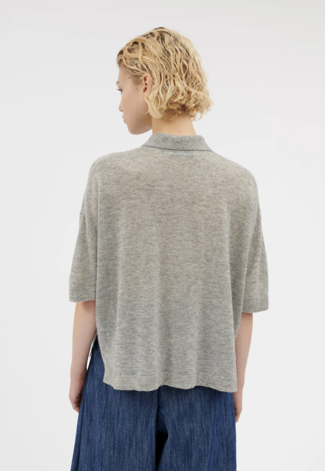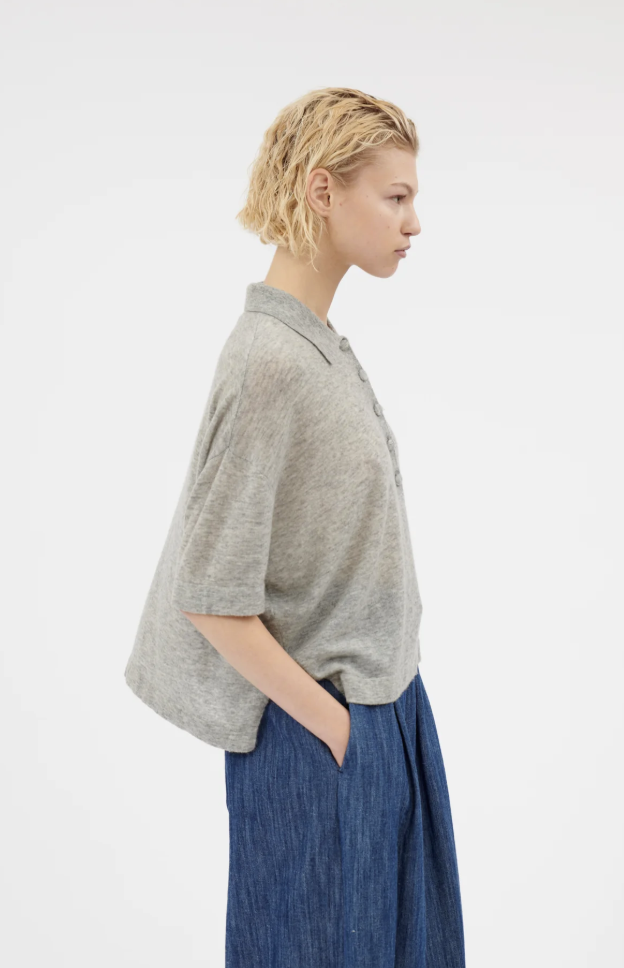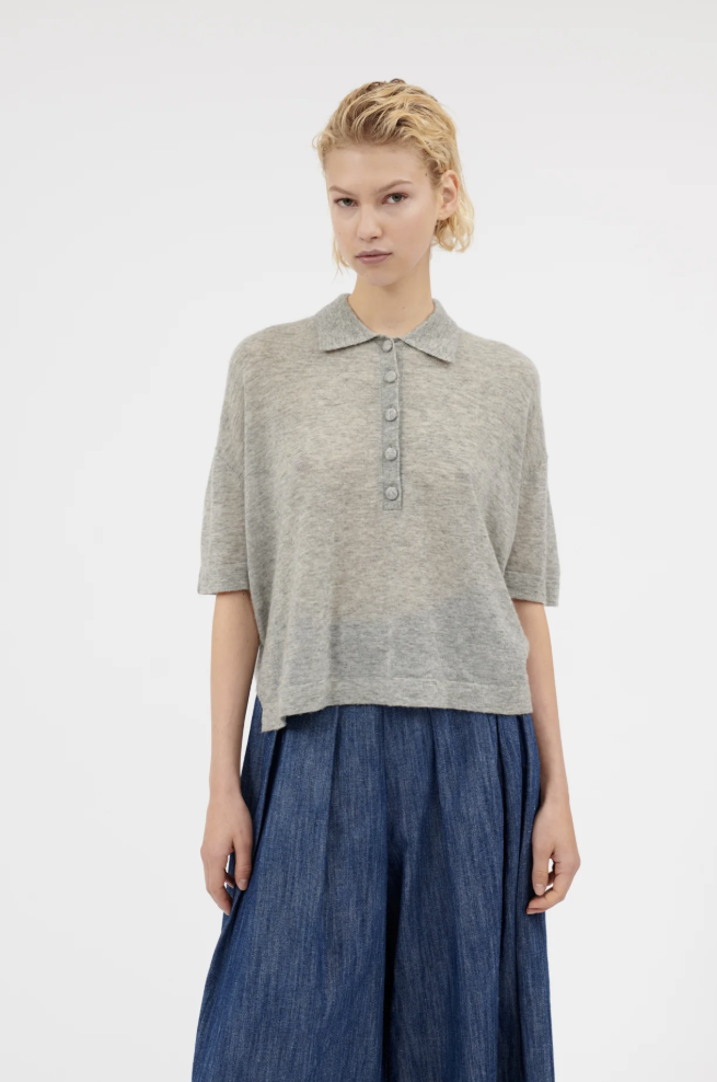 Der Polokragen mit stoffbezogenen, tonalen Knöpfen verleiht dem Design eine feminine Note und unterstreicht den hochwertigen Look. Seitenschlitze und die softe Feinstrickqualität runden das Gesamtbild stilvoll ab. Die Farbe Pearl Grey wirkt clean, modern und lässt sich vielseitig kombinieren — von Denim über elegante Hosen bis hin zu Röcken.