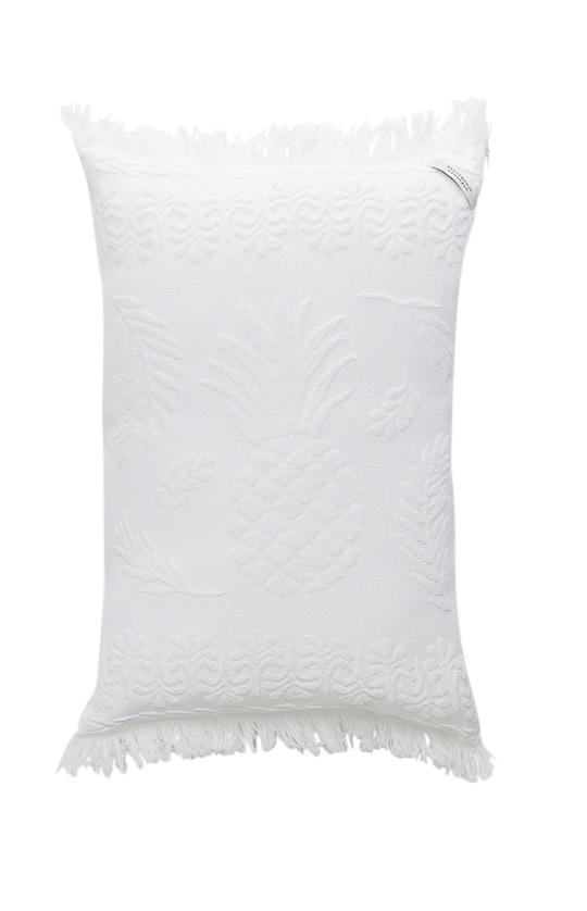 Das Kissen mit Jacquardmuster in camellia white von Dorothee Schumacher verbindet weiche Baumwollqualität mit einer ruhigen, strukturierten Optik. Das fein eingewebte Ananas-Motiv verleiht dem Design Tiefe, während die Fransenkanten eine leichte, sommerliche Note setzen. In seiner klaren Farbgebung wirkt das Kissen besonders harmonisch und fügt sich mühelos in eine entspannte, hochwertige Umgebung ein.