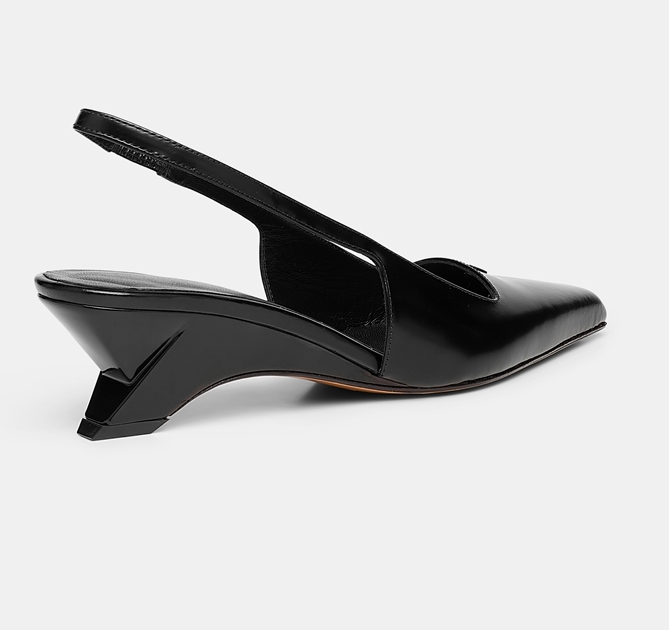 Die Slingback-Pums von DOROTHEE SCHUMACHER sind aus softem Kalbsleder gefertigt und haben ein leicht glänzendes Finish, der Absatz hat eine graphishe Silhouette.
