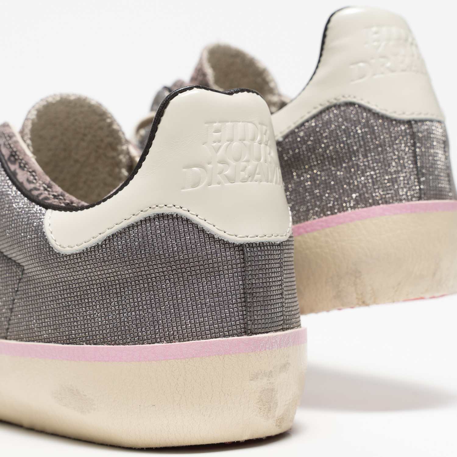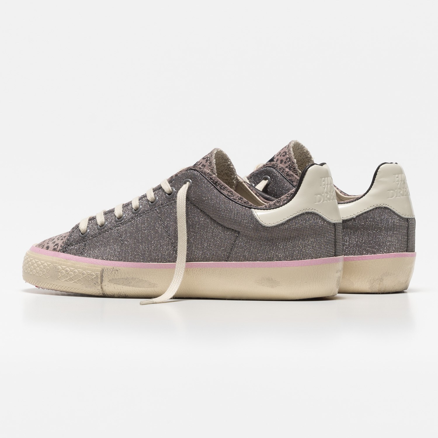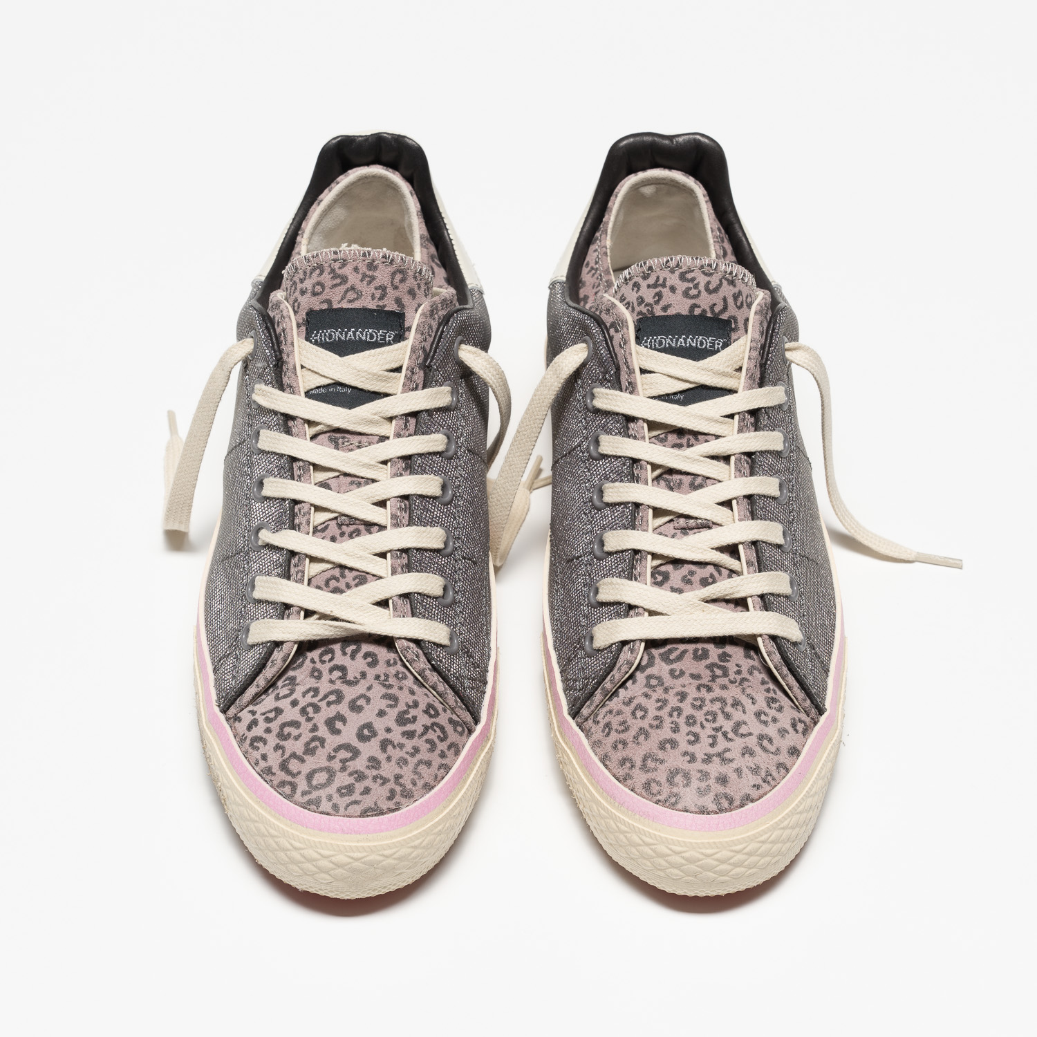 Glitzernder Sneaker von HIDNANDER mit rosfarbener Leo-Optik und roter Gummisohle.
