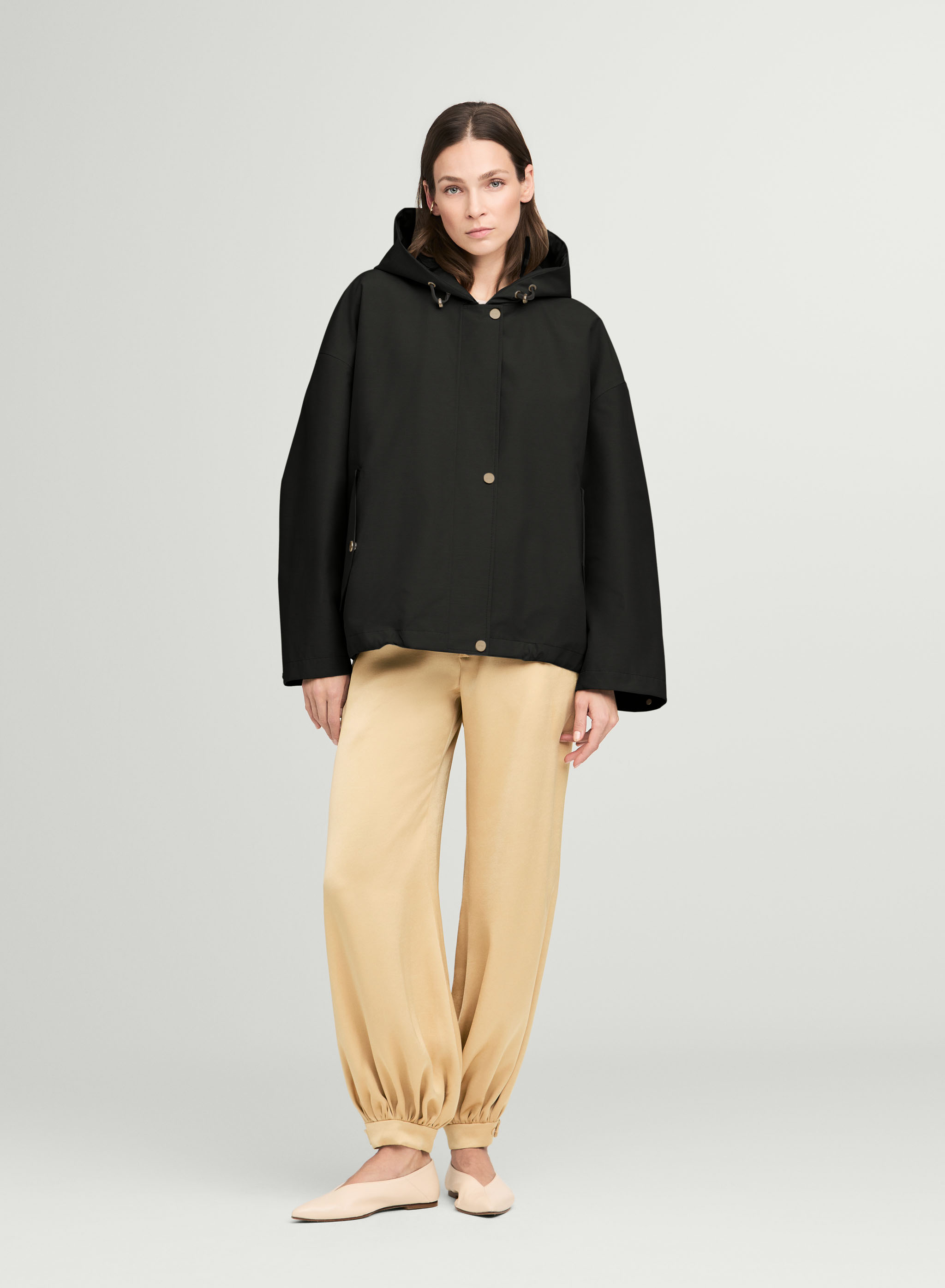 Ideal zu fließenden Hosen oder schmalen Silhouetten entsteht ein spannender Kontrast zur markanten Form der Jacke. Helle Naturtöne unterstreichen die Tiefe von Schwarz, während monochrome Looks den puristischen Charakter betonen. Sneaker oder cleane Flats runden das Outfit modern ab.