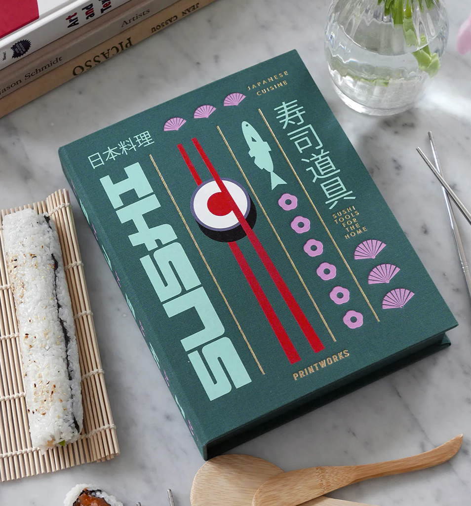 Endecken Sie unser Essential Kit für Sushi-Abende von PRINTWORKS, geschickt getarnt als elegante buchänliche Box. Beim Öffnen endecken Sie alle wichtigen Werkzeuge für ein erfolgreiches Sushi-Abenteuer. Ale Werkzeuge sind aus rostfreiem Stahl und spülmaschinenfest.