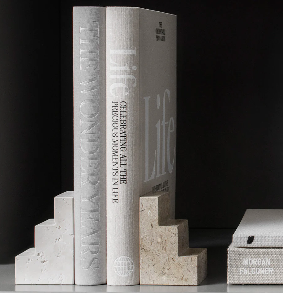 Life Fotobuch: Beiger Hardvover-Einband aus Stoff mit weißem Text für ein minimalistes und elegantes Bücherregal-Design.