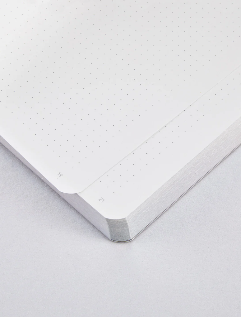 - Flexcover-Notizbuch mit Fadenheftung, 176 Seiten, 3.5 mm Punktraster, Seitenzahlen, perfektes Aufschlagverhalten, holografischer Farbschnitt, elastisches Anti-Handbag-Textilband, vegan