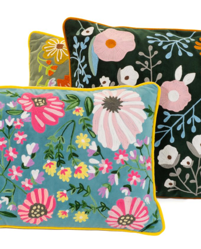 Das Kissen lässt sich hervorragend mit schlichten, einfarbigen Kissen kombinieren, damit die Stickerei im Mittelpunkt steht. Besonders harmonisch wirken Naturtöne, warmes Sand oder gedecktes Grün. In Kombination mit anderen floralen Textilien entsteht ein verspielter, wohnlicher Look.