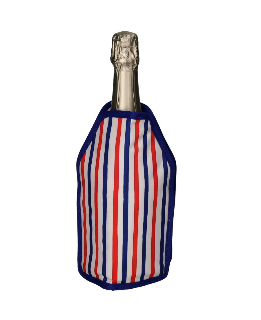 - Produkteigenschaften: Kühlmanschette mit Gel-Füllung, Streifenmotiv mit Schriftzug „Vivre d’Amour et de Champagne“, Maße 16 x 2 x 23,5 cm