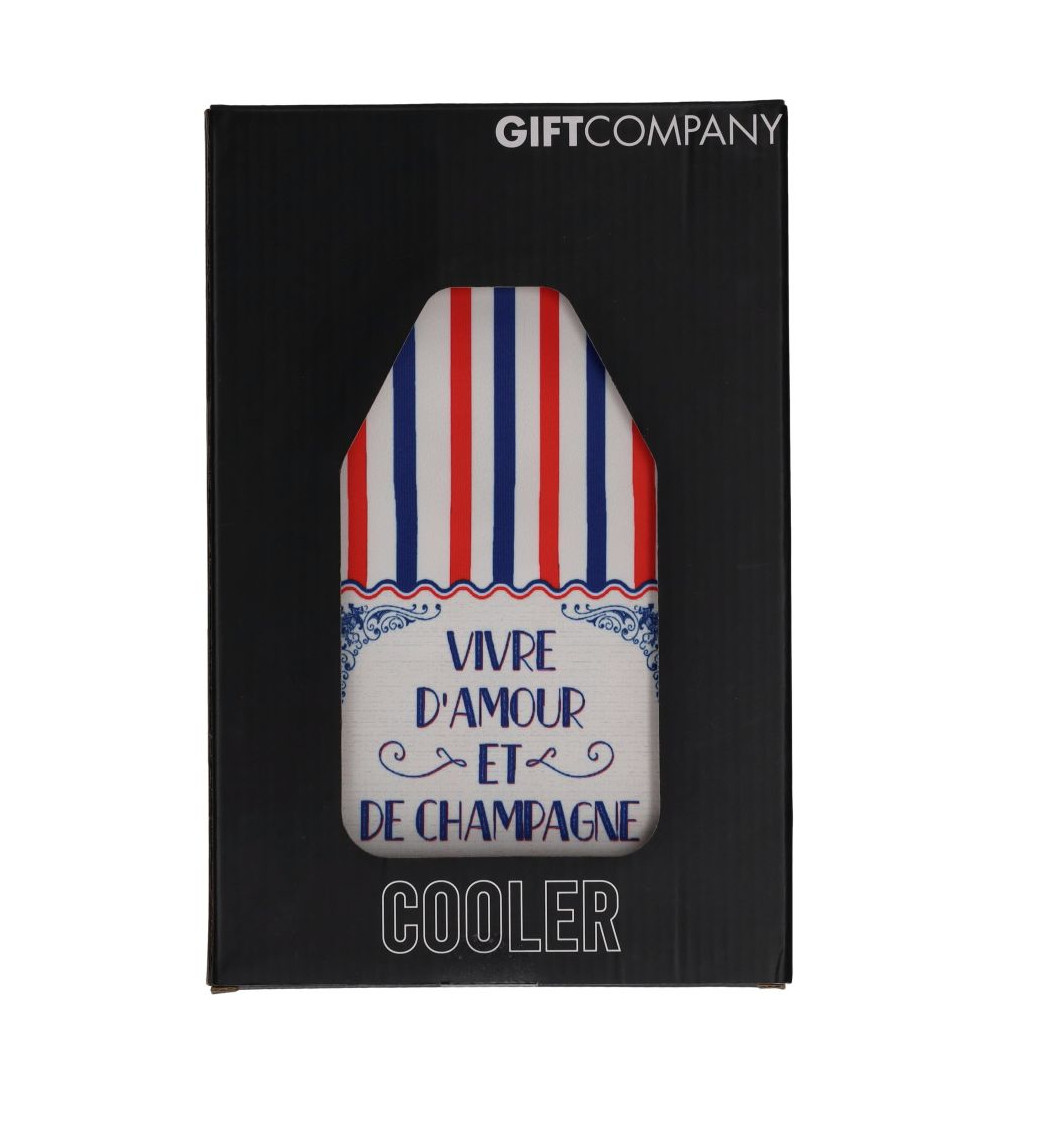 Eine Kühlmanschette mit französischem Flair, die Genussmomente stilvoll begleitet. Das Streifenmuster in Rot und Blau erinnert an klassische Bistro-Ästhetik, während der Schriftzug „Vivre d’Amour et de Champagne“ einen charmanten, lebensfrohen Akzent setzt. Die flexible Gel-Füllung hält Flaschen angenehm kühl und macht dieses Accessoire von Gift Company zu einem dekorativen Begleiter für gesellige Abende.