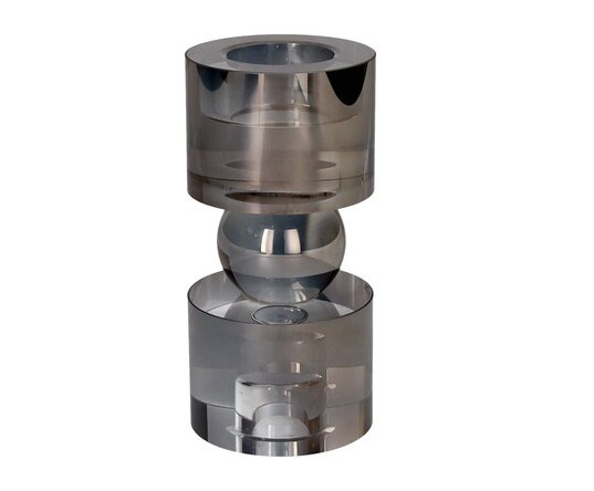 Ein skulpturaler Kerzen- und Teelichthalter aus getöntem Kristallglas, der mit klarer Form und moderner Transparenz überzeugt. Die geometrischen Elemente wirken wie übereinander gesetzte Glasformen und erzeugen eine ruhige, elegante Präsenz. Das graue Glas von Gift Company reflektiert Kerzenlicht besonders weich und schafft eine stimmungsvolle Atmosphäre – ob mit Stabkerze oder Teelicht.