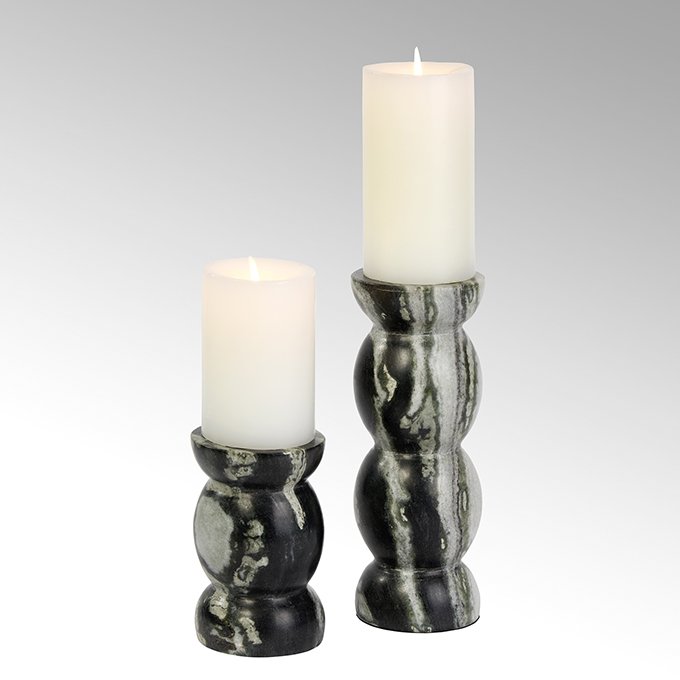 - Schnitt/Passform bzw. Produkteigenschaften: Handgefertigter Kerzenleuchter aus Black Panda Marmor mit geschwungener Form